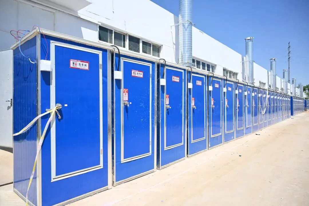 记者看到,在方舱医院病区外,每个方舱病区旁边都设置有成排的洗手间。洗手间底部有约1米x1米大小,两米多高。内设有紧急呼叫器、紫外线灯、洗手池、冲水箱等。洗手间上方设有排气扇。