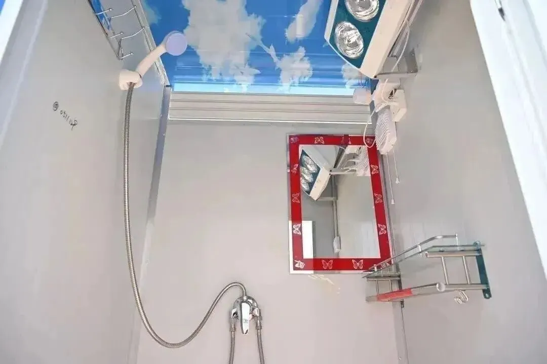 淋浴间底部约有一米乘一米大小,两米多高。内设有浴霸、热水器等。