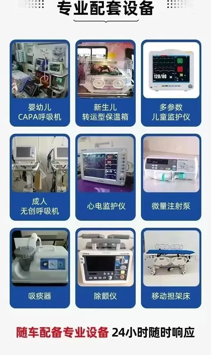 车辆全部正规备案,定期全面检查、严格消毒,车内环境干净舒适。根据患者需求配备专业设备,包括担架、吸氧装置、心电监护、输液泵、吸痰器等,重症转运可配备呼吸机等急救设备,确保途中生命安全。