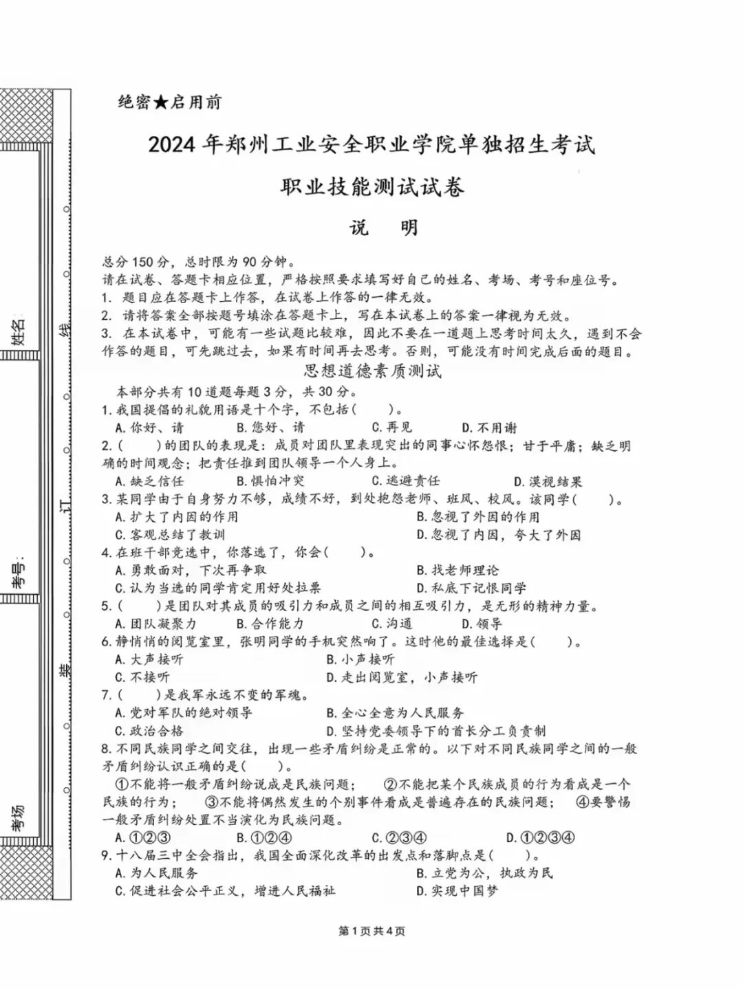 >郑州工业安全职业学院2024年单招考试职业技能测试试卷