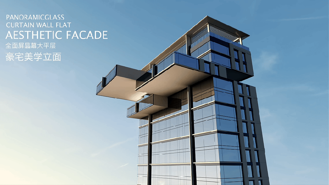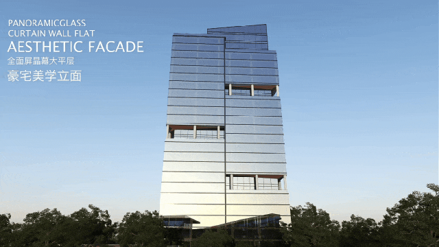 采用公建化晶幕立面设计,搭配全落地窗与超高窗墙比,比传统带露台的四代宅空间利用率更高,私密性更好,安全性更好,材质上选用纯铝板与玻璃组合,质感与颜值兼具。