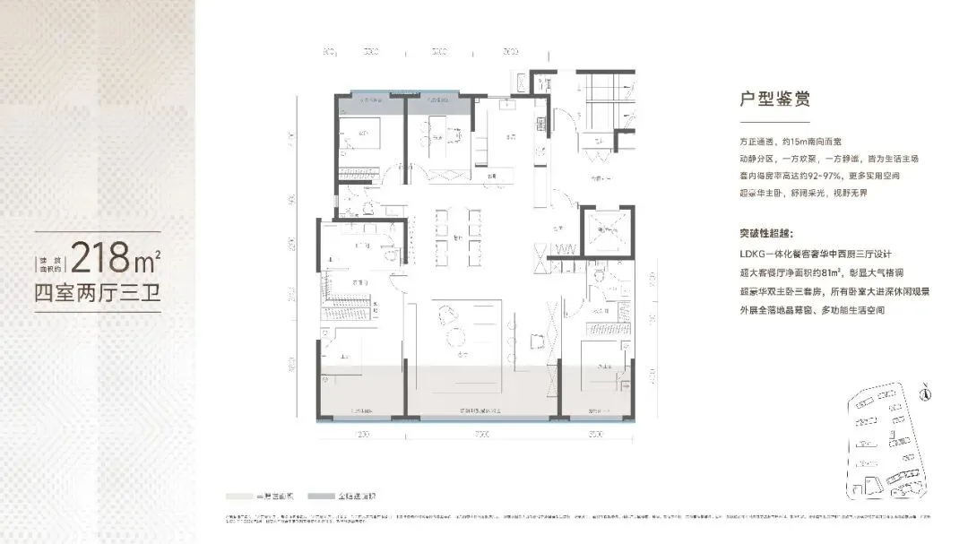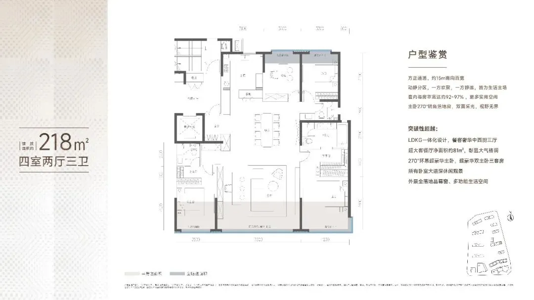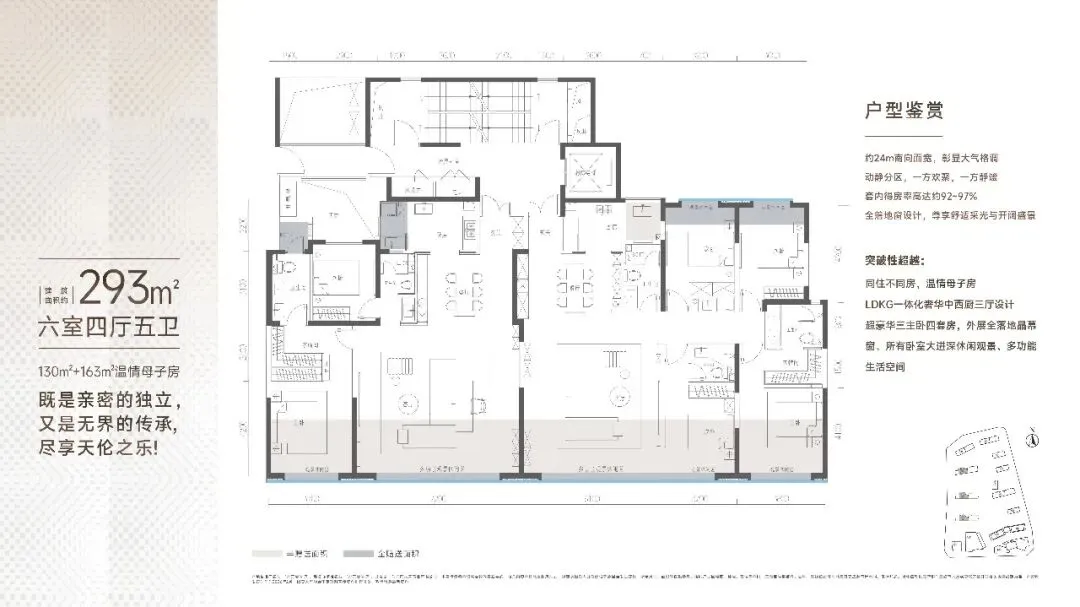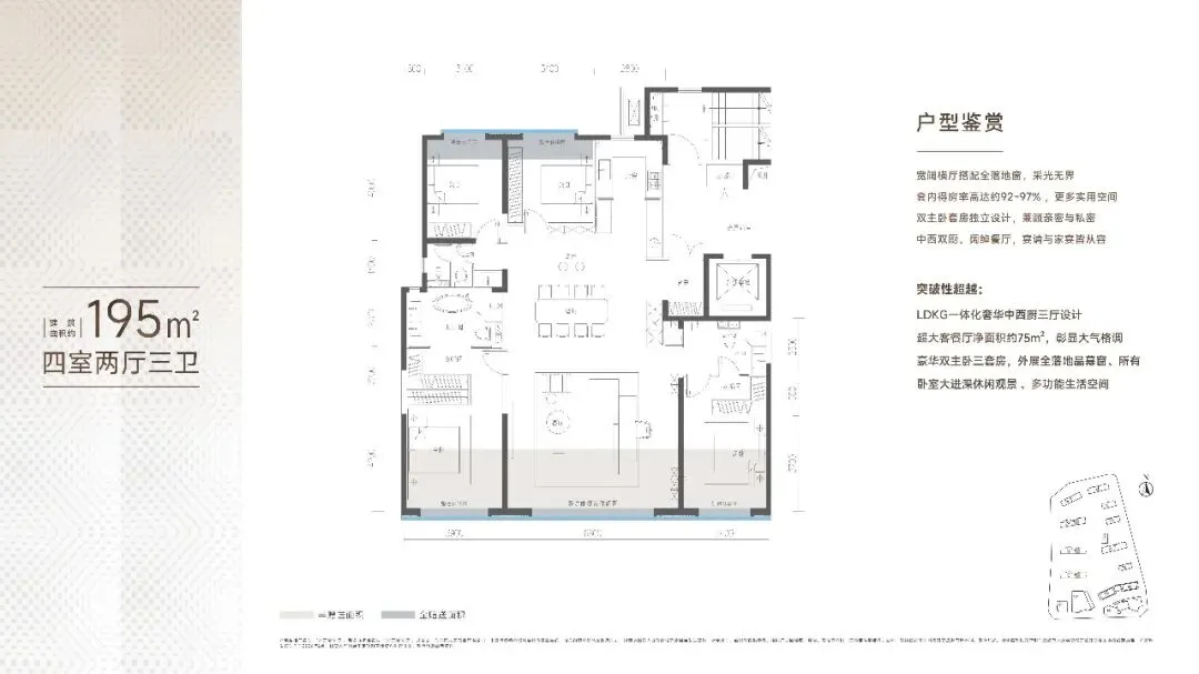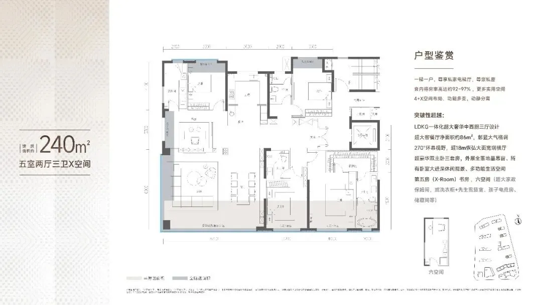 主打165-430㎡全新大户型,规划三厅大横厅与三套房设计,得房率高达92%-97%,空间利用率领先。
