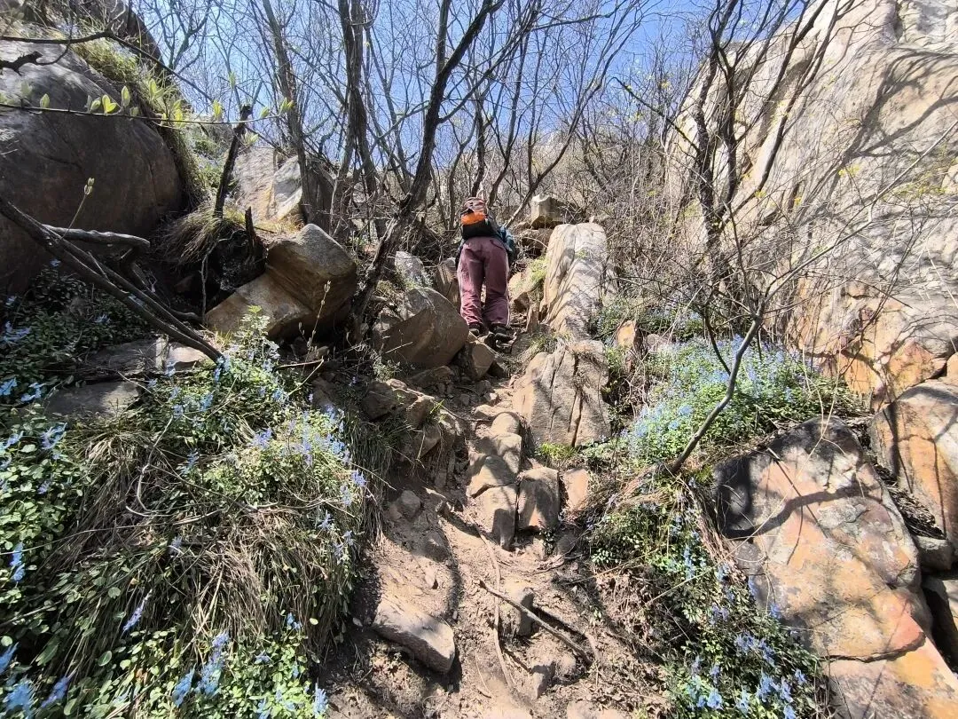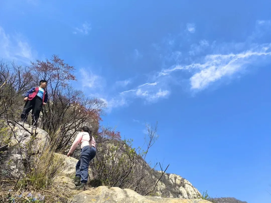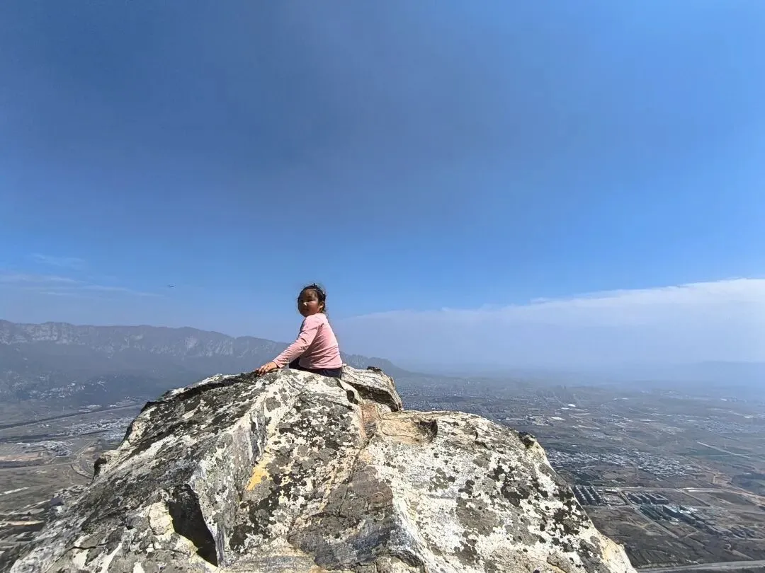 一路花香,沁人心脾,心花怒放。 蓝天白云,晴空万里,阳光下的攀爬更有意义,接地气,接阳气! “夏天无”蓝色的小花朵随风摇摆,一路生花,一路芬芳。 这块大石头,下面是深渊,怎么看都吓人,却是极好的打卡点。 小朋友与我们合影,她说有点怕怕,不敢一个人坐在上面呢! 目的地越来越近,小朋友听说上山顶可以吃饭了,立刻加快脚步。终于登顶,完美!