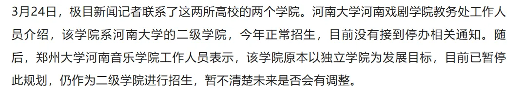 近日有网友爆料,河南大学河南戏剧学院与郑州大学河南音乐学院均面临停办。