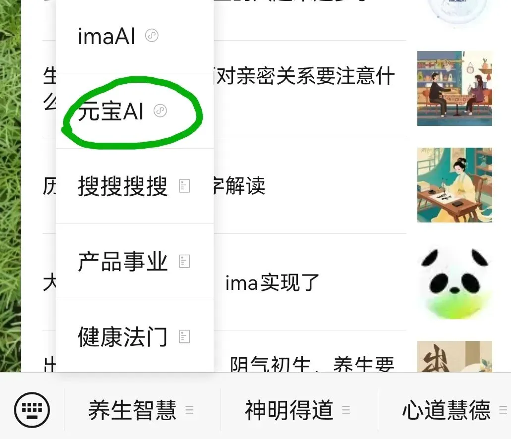操作很简单:点文首蓝色“照见洞见”,点发消息,再点上面“养生智慧”→元宝AI→发消息就可以了。