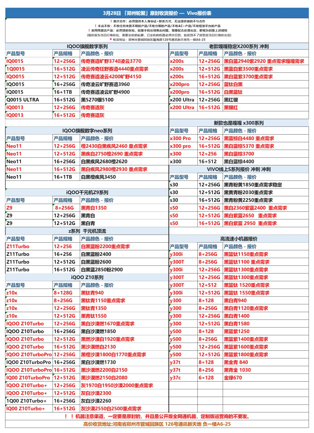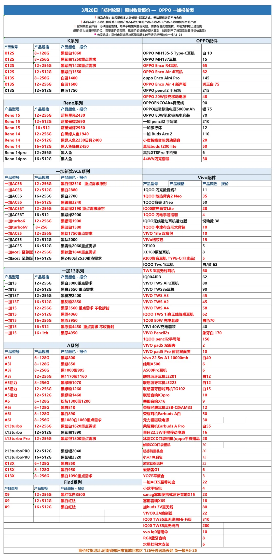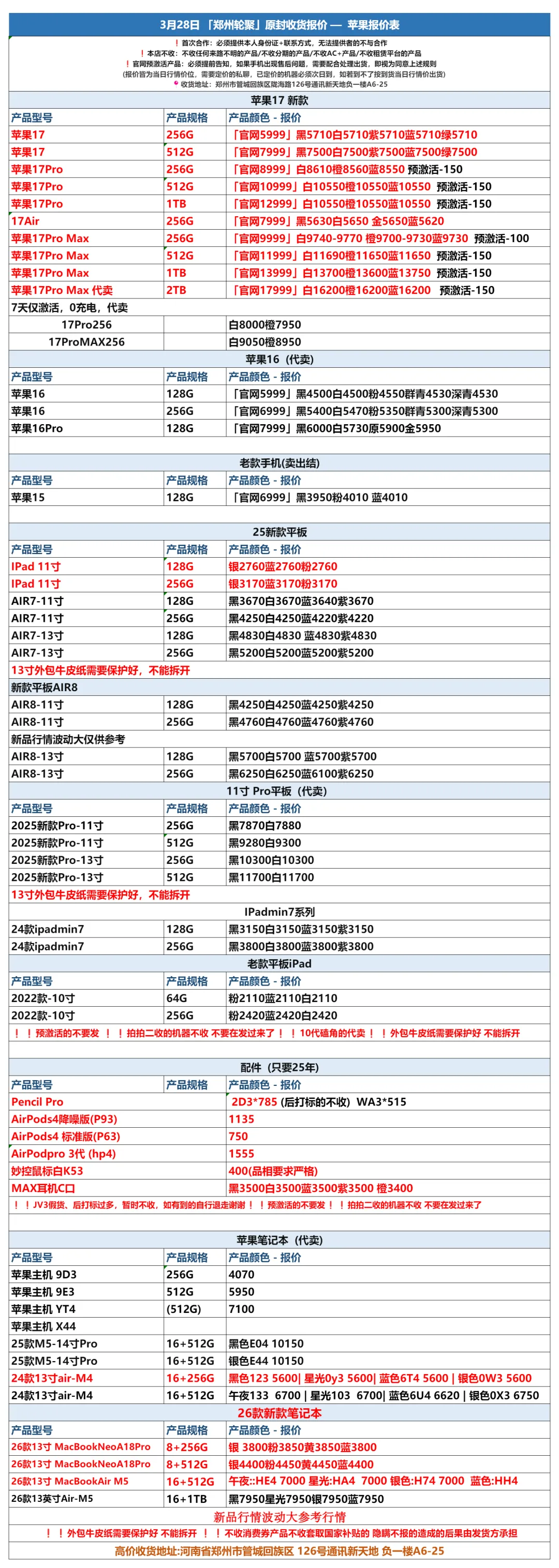 >郑州轮聚通讯 2026年3.28日数码报价更新