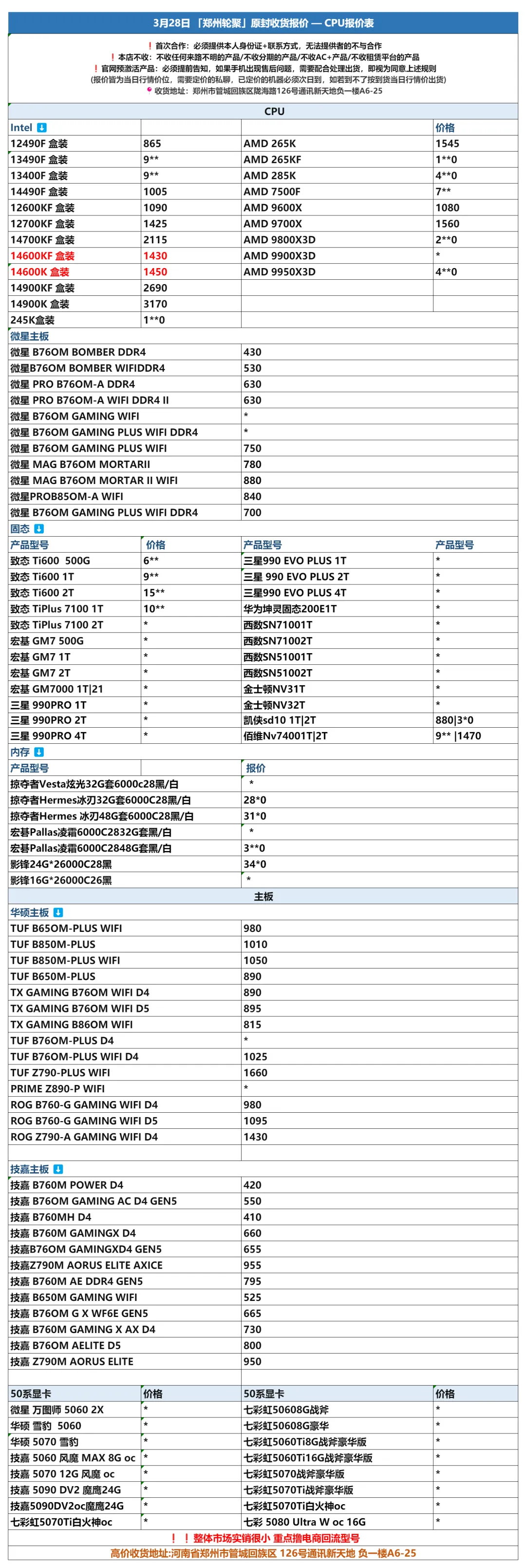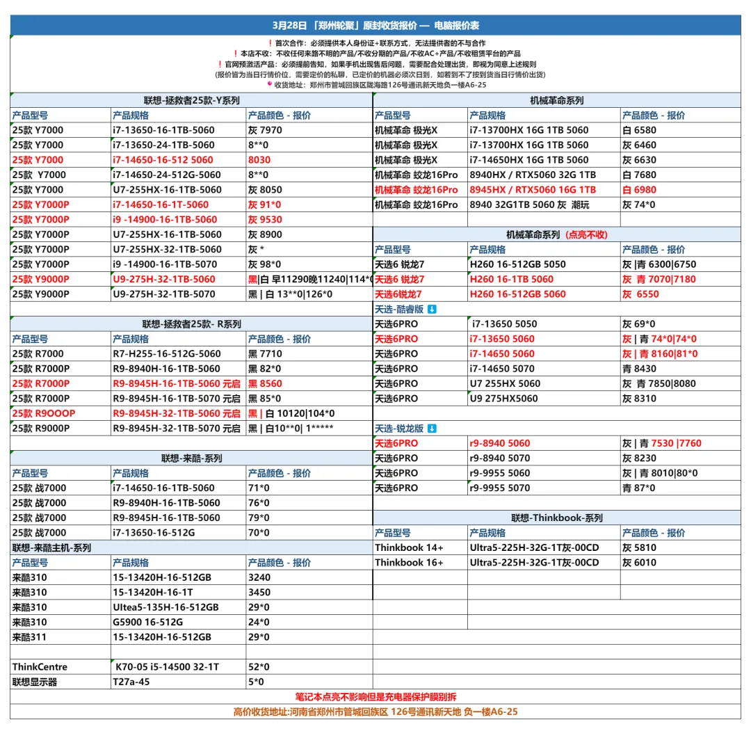 郑州轮聚通讯 2026年3.28日数码报价更新
