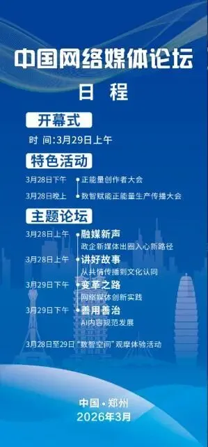 3月28日至29日,2026年中国网络媒体论坛在郑州召开。全国相关机构、学界、媒体与互联网代表齐聚,共议网络内容建设。本届论坛设置了多场重头活动,即“特色活动+主题论坛”,其中,特色活动于3月28日正式开幕,包括“正能量创作者大会”“数智赋能正能量生产传播大会”两个版块;4场主题论坛分别为“融媒新声”“讲好故事”“变革之路”“善用善治”。(中国日报)