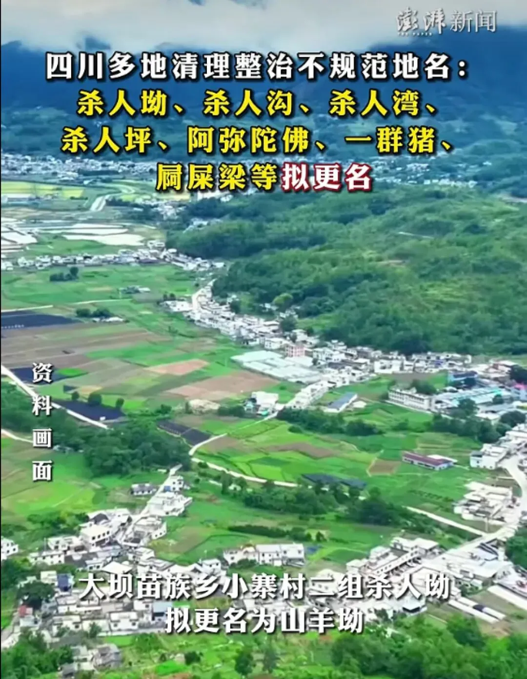 近日,四川省内多个县市民政局发布部分乡镇的地名拟更名公示,推进不规范地名清理整治工作。如兴文县周家镇洛浦村四组“杀人坳”拟更名为桂花坨,古宋镇金龙村二组“一群猪”拟更名为一碗水;宣汉县峰城镇天府社区“屙屎梁”,因形似石梁的地形特征,拟更名为“阿石梁”。(澎湃新闻)