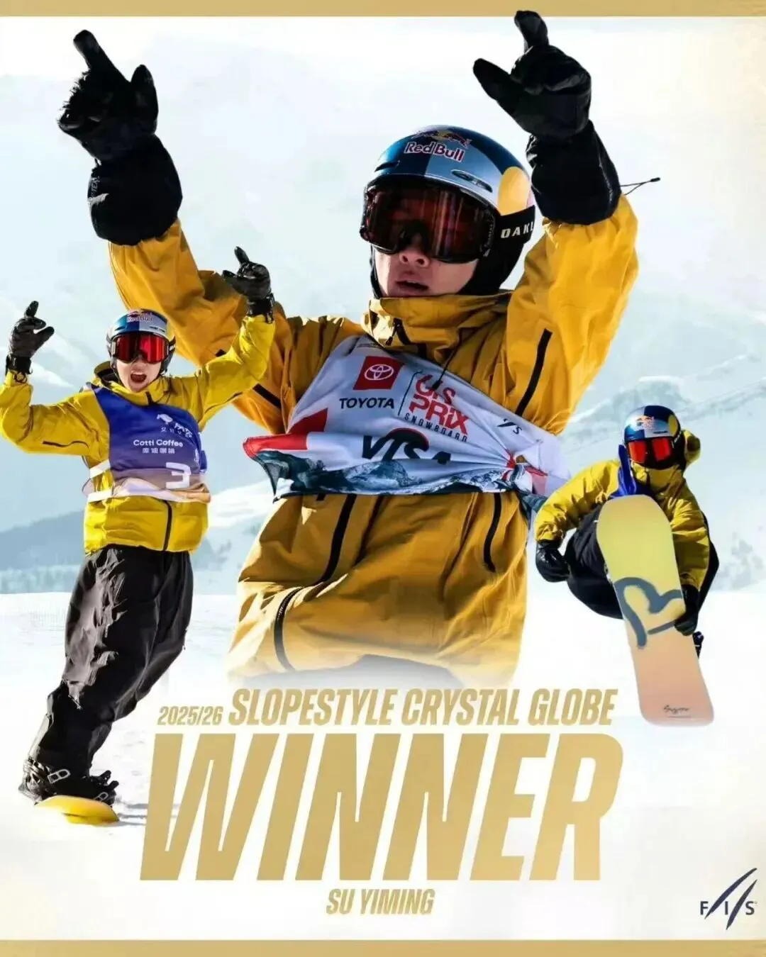 3月28日,国际雪联通过社交媒体平台宣布,奥运冠军、中国选手苏翊鸣加冕2025-2026赛季单板滑雪男子坡面障碍技巧世界杯总冠军。(中新社)