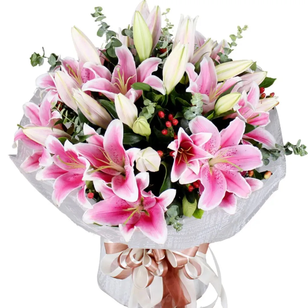 温馨相伴- 8枝多头粉百合,搭配适量尤加利、红豆、栀子叶