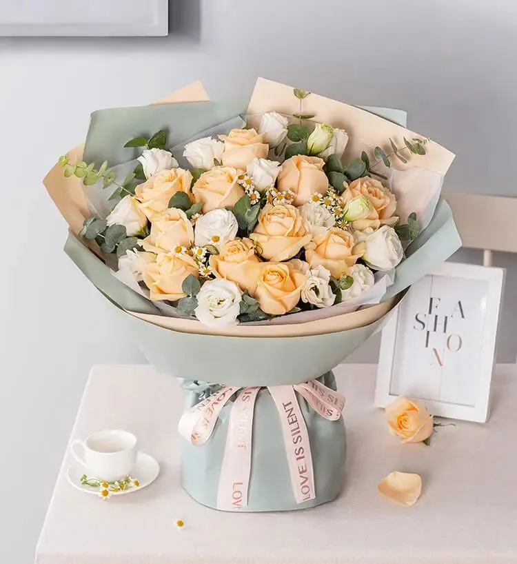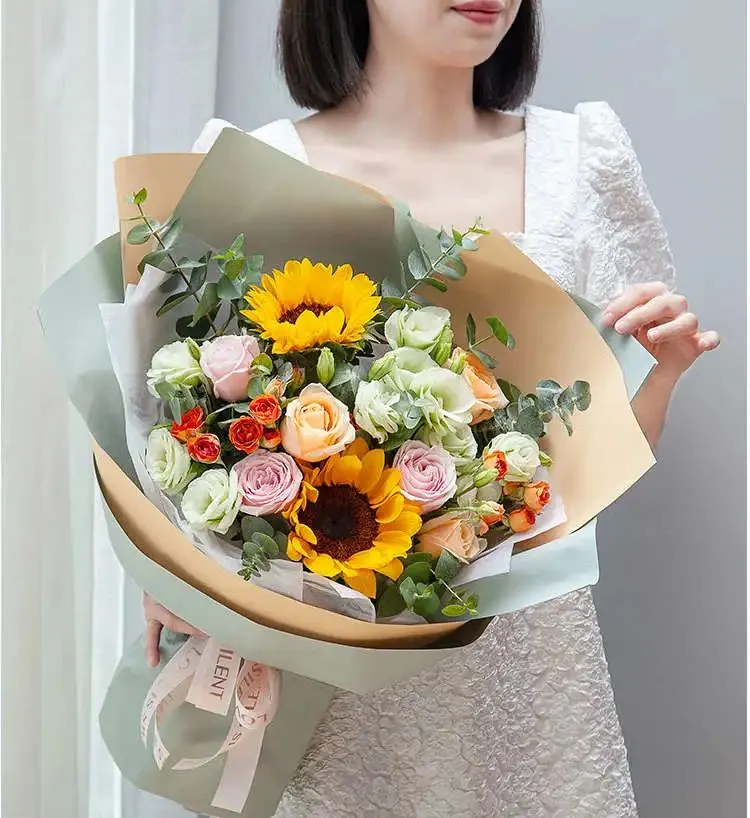 人在外地?爱从不缺席无论您身在何处,尚花客全国300+城市配送网络为您架起爱的桥梁。异地也能让亲友准时收到鲜花,让距离不再是表达爱的阻碍。爱如阳光-香槟玫瑰3枝、向日葵2枝、粉红雪山玫瑰3枝、绿色洋桔梗3枝、橙色多头玫瑰2枝、尤加利叶5枝