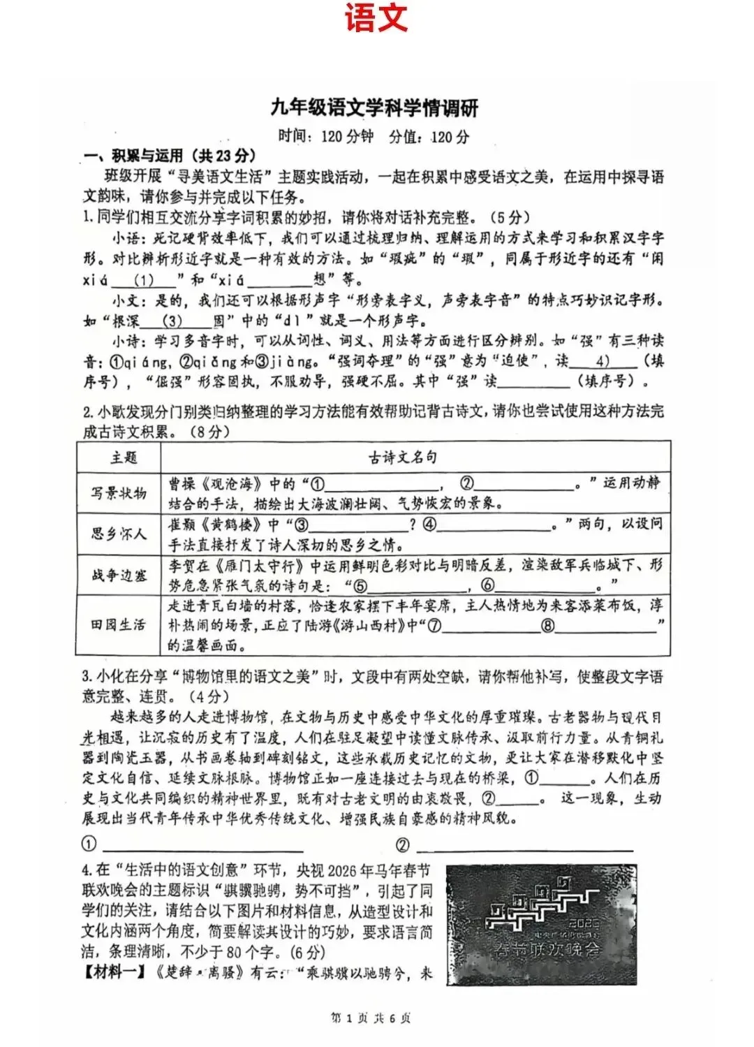 >郑州外国语中学2025-2026学年九年级下语文模考试题及答案