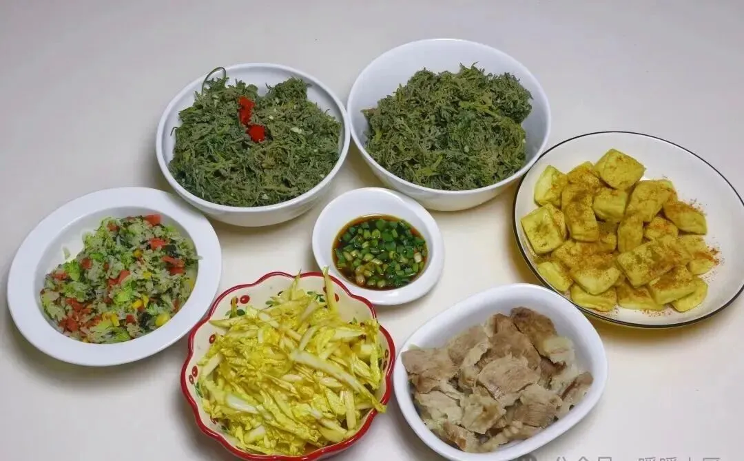尤其这碗野菜,真的太有生活感了。不是精致摆盘,也没什么油光锃亮,就是一大碗,装得实实在在。上头点两颗红椒,像是随手一摆,却一下子把颜色提起来了。你看着就知道,这不是为了拍照做的,是认真准备给家里人吃的。