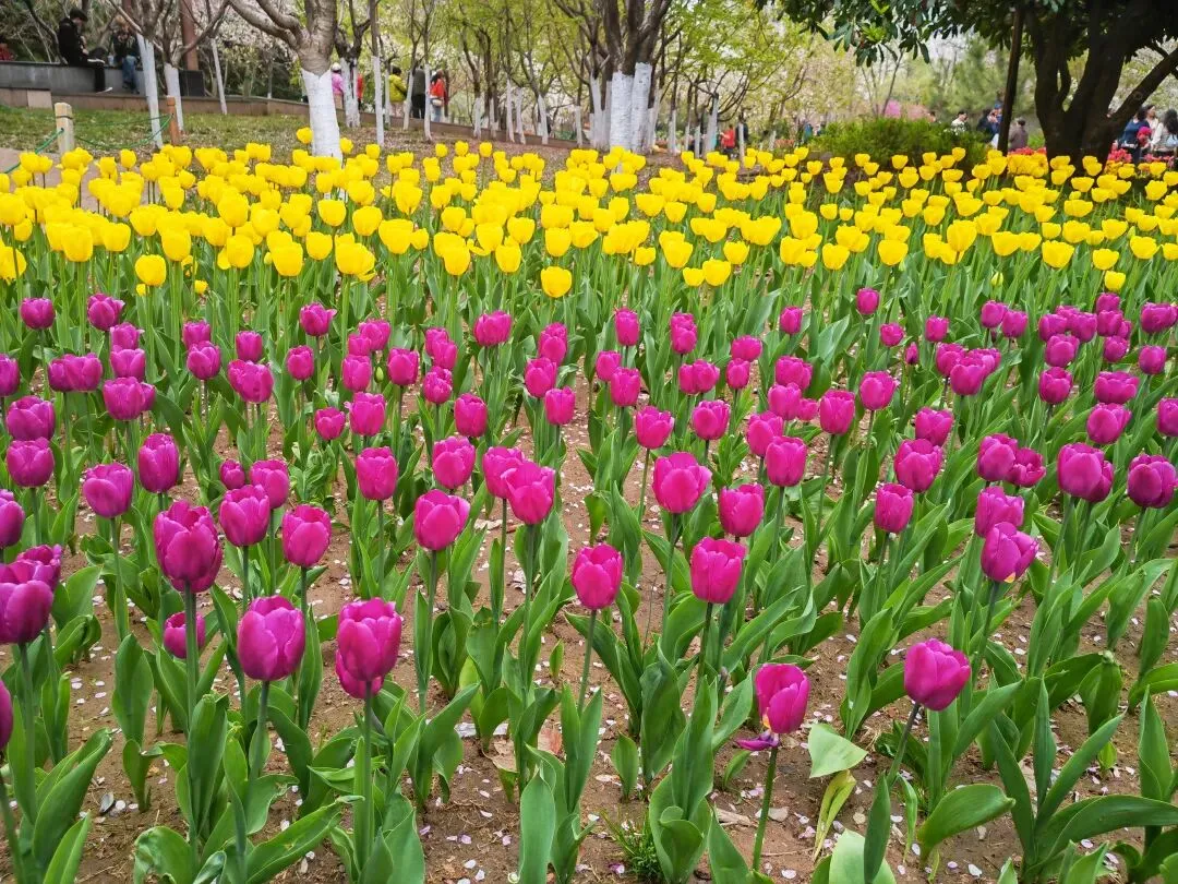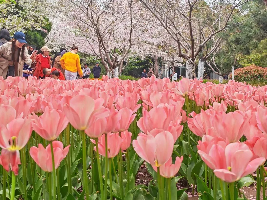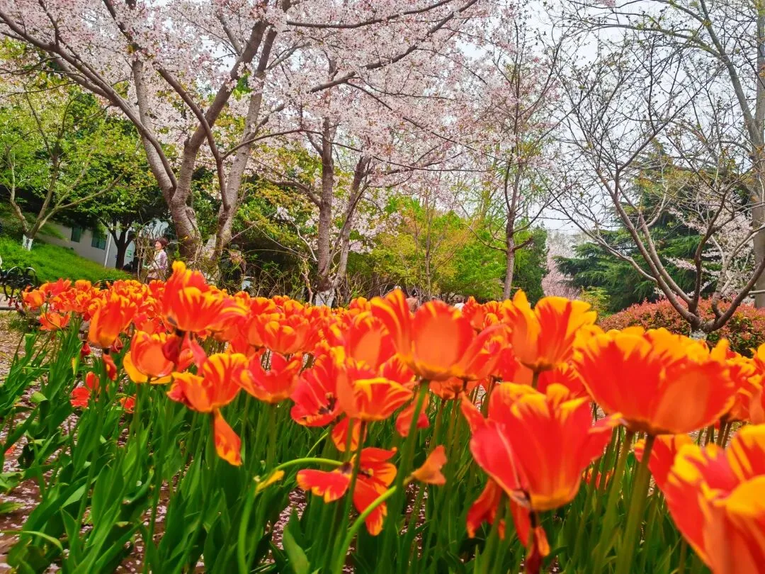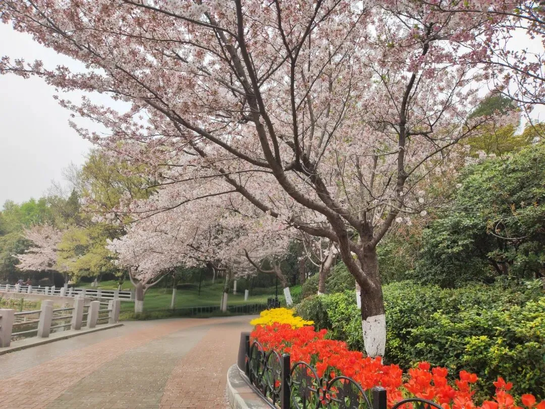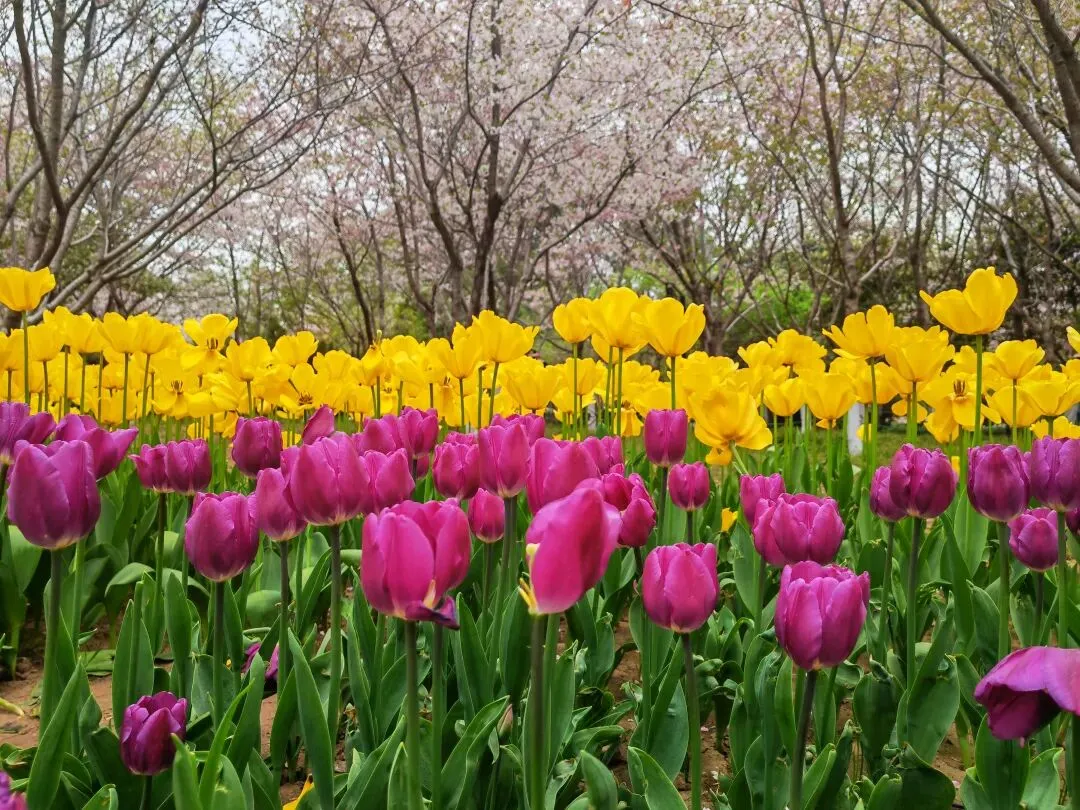 公园内特意在樱花树附近栽种了各类品种的郁金香,从嫣红开到绛紫,铺成斑斓的花海。微风轻拂时,落樱纷扬如雪,樱花花瓣飘落至郁金香花田间,形成“郁樱缤纷”的浪漫景致。