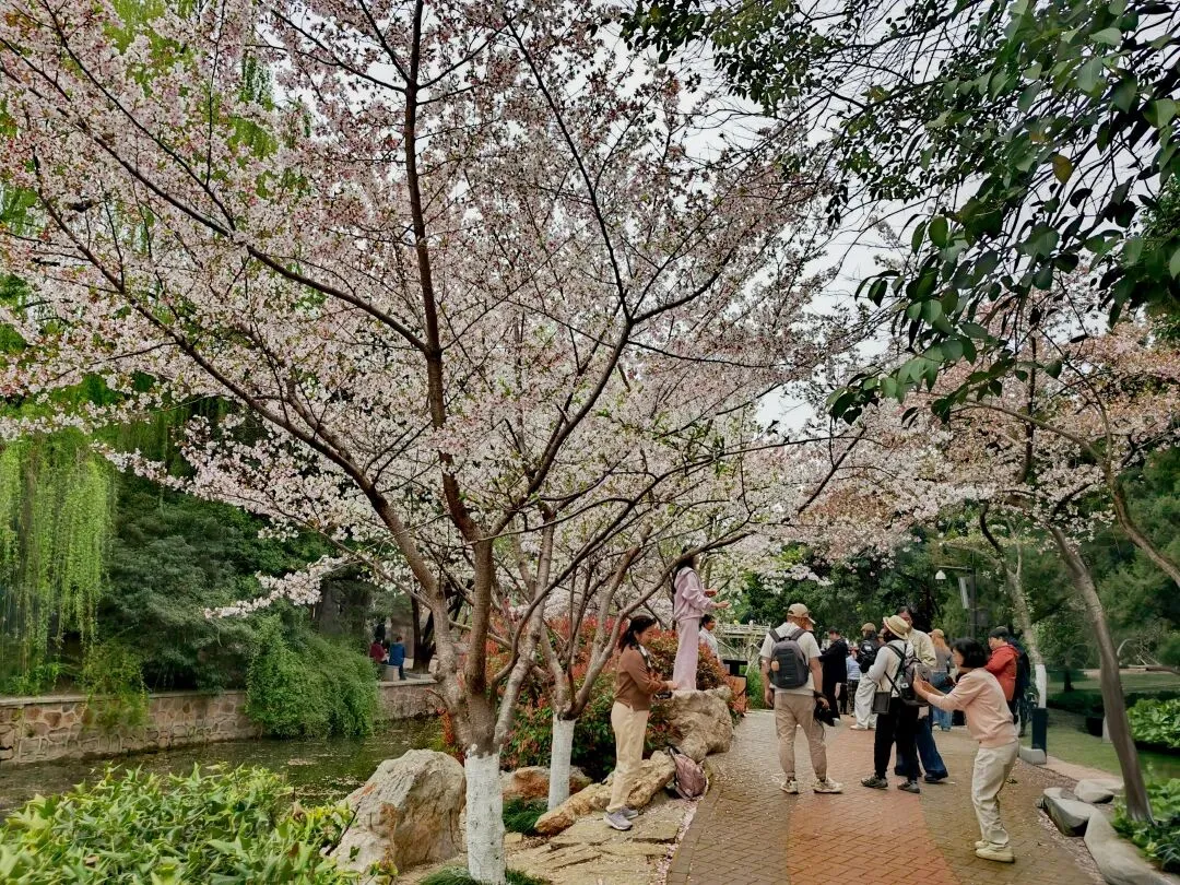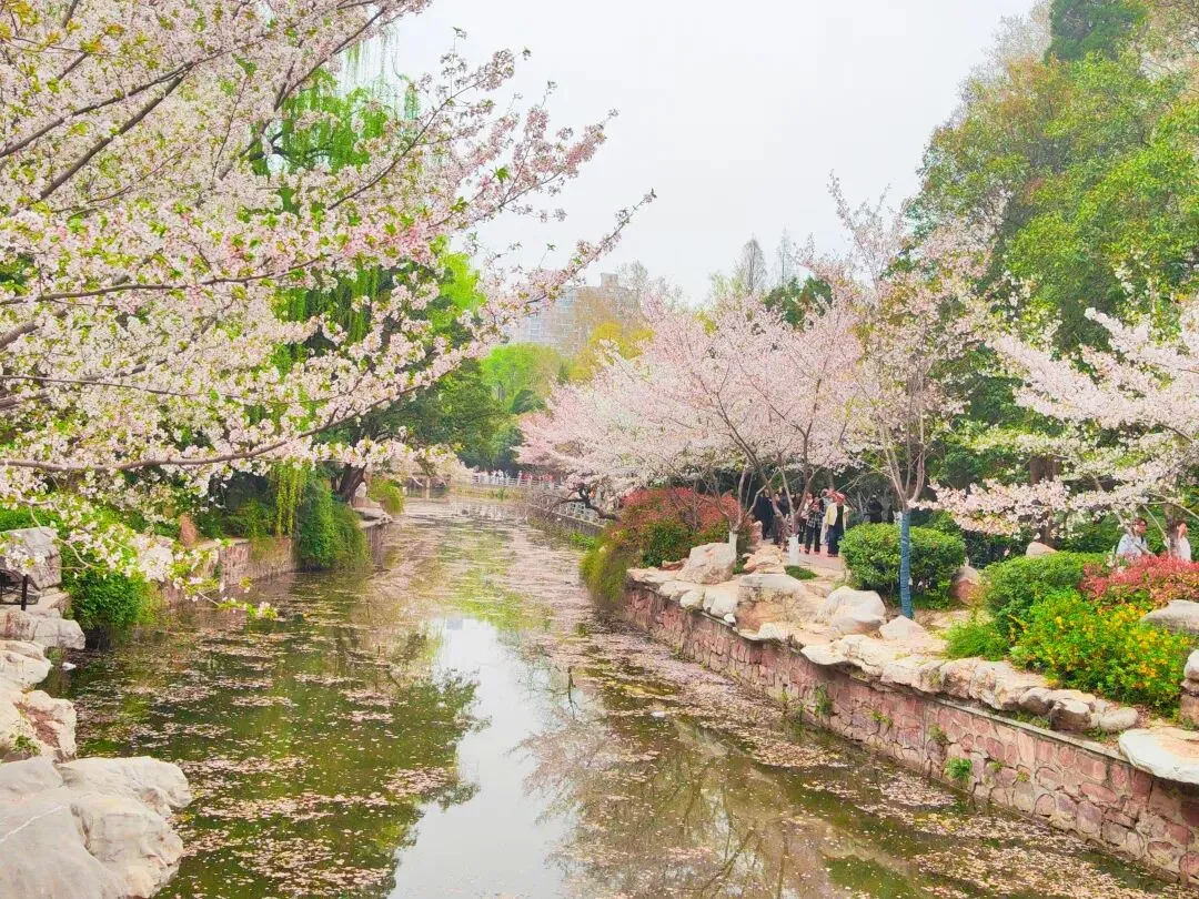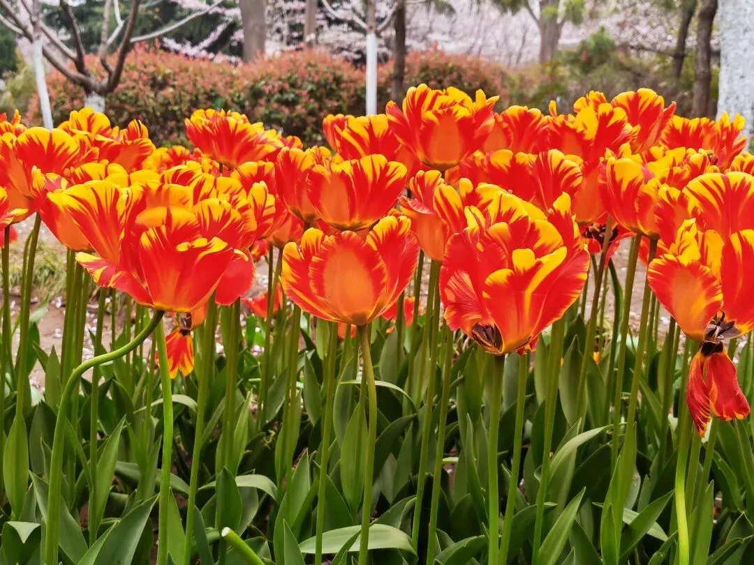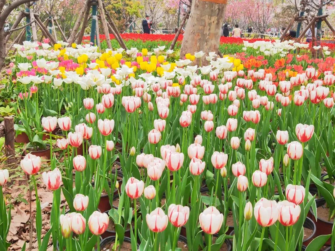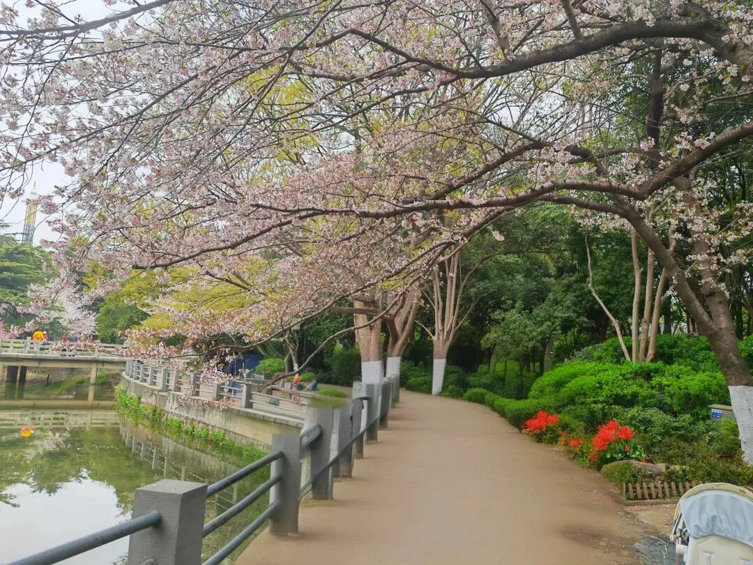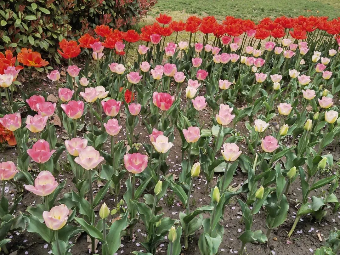 公园内特意在樱花树附近栽种了各类品种的郁金香,从嫣红开到绛紫,铺成斑斓的花海。微风轻拂时,落樱纷扬如雪,樱花花瓣飘落至郁金香花田间,形成“郁樱缤纷”的浪漫景致。