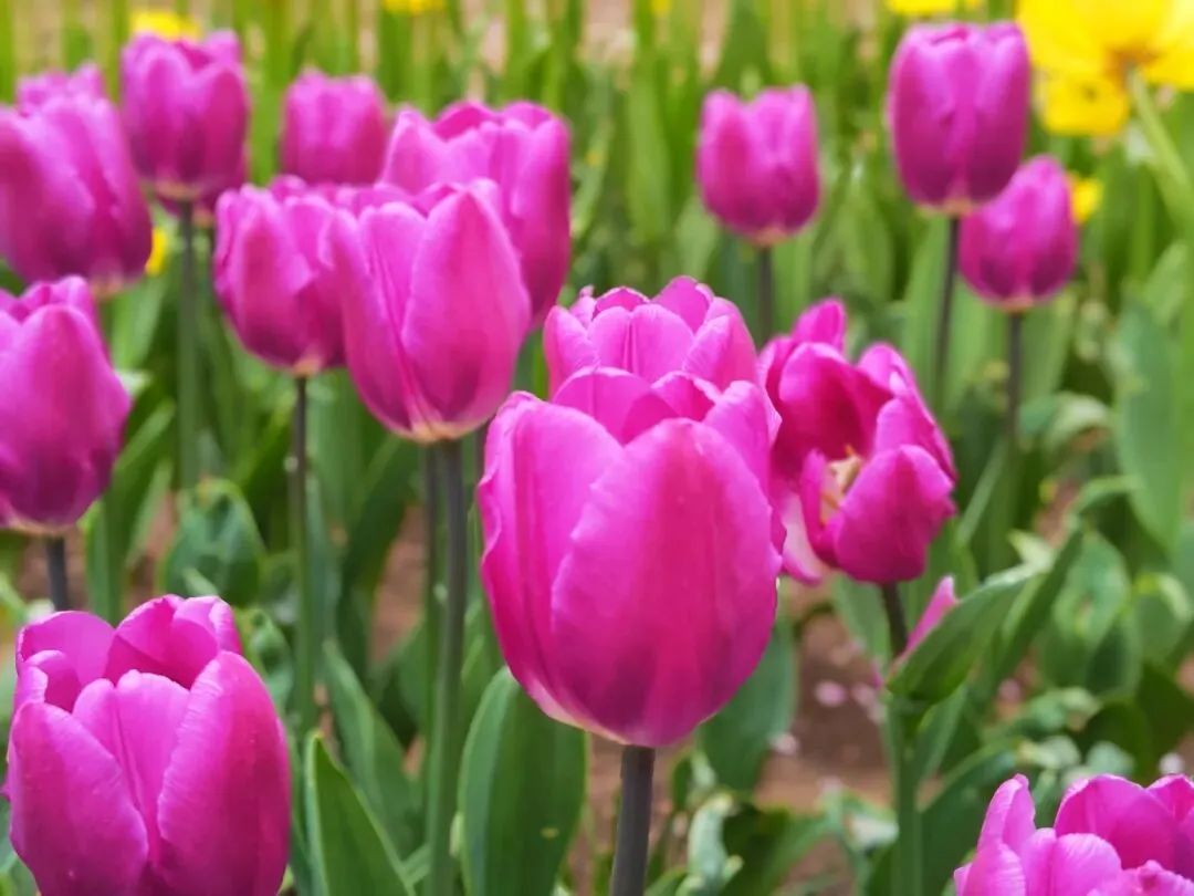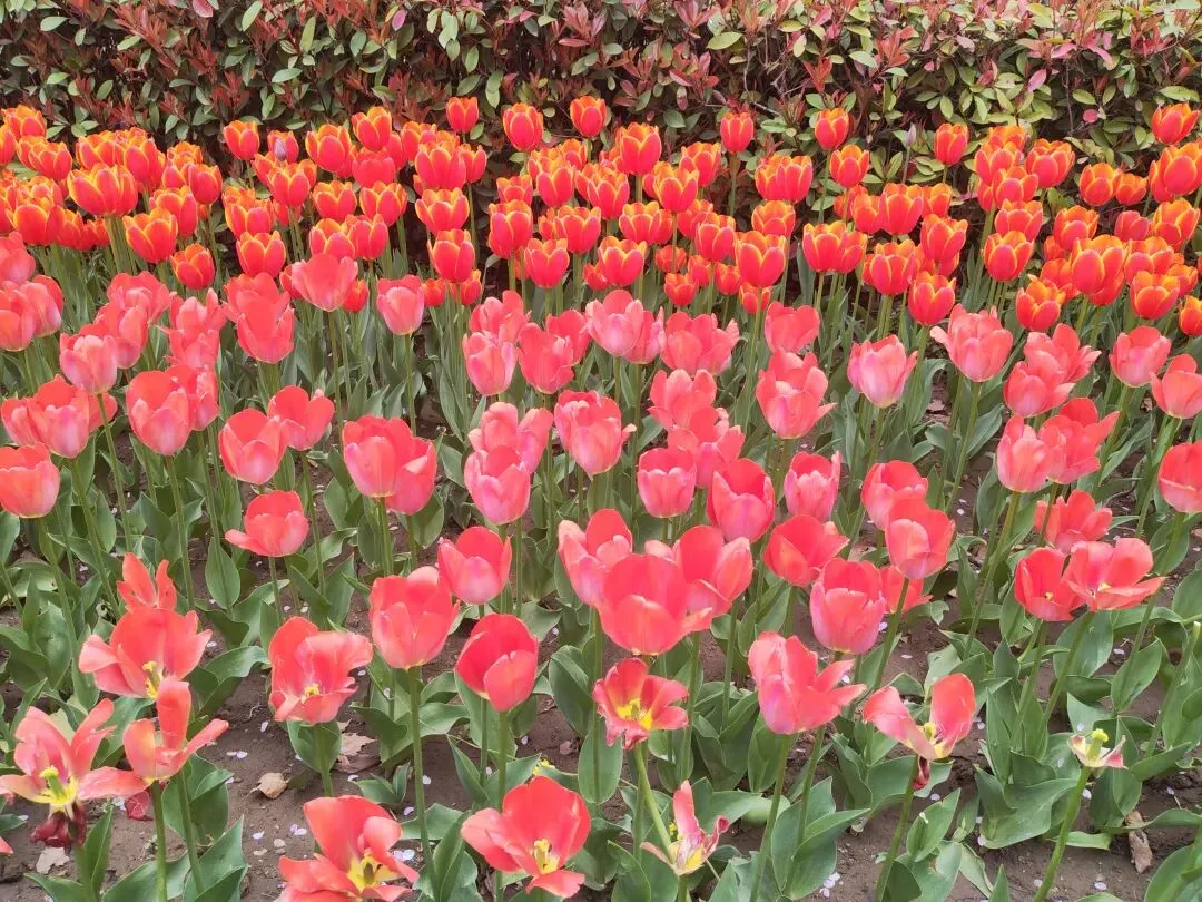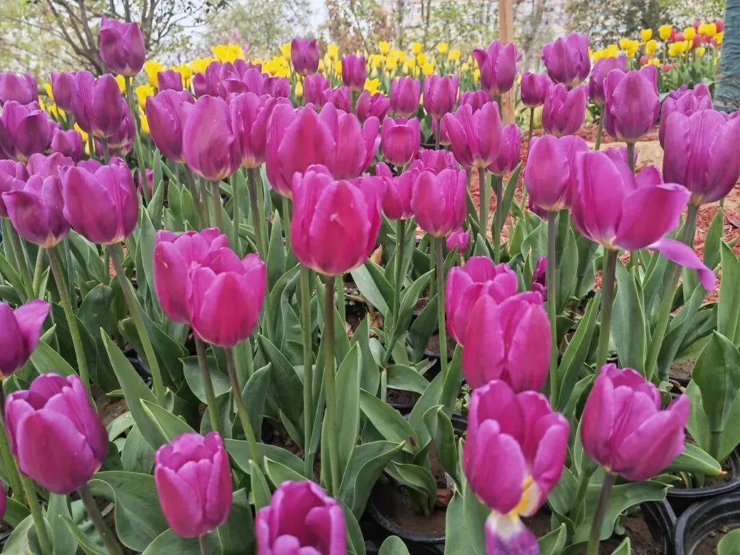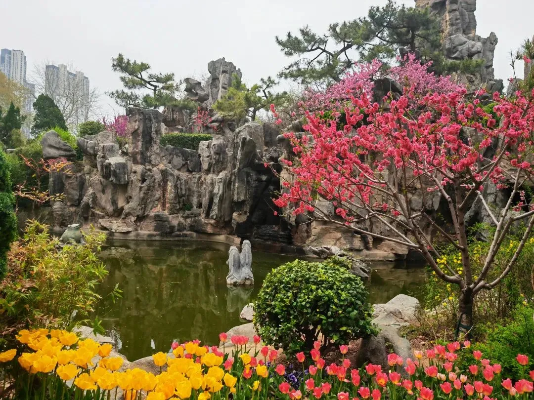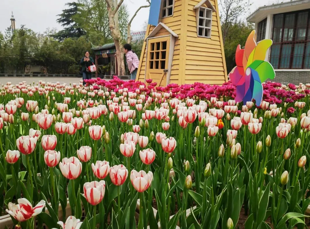 公园内特意在樱花树附近栽种了各类品种的郁金香,从嫣红开到绛紫,铺成斑斓的花海。微风轻拂时,落樱纷扬如雪,樱花花瓣飘落至郁金香花田间,形成“郁樱缤纷”的浪漫景致。