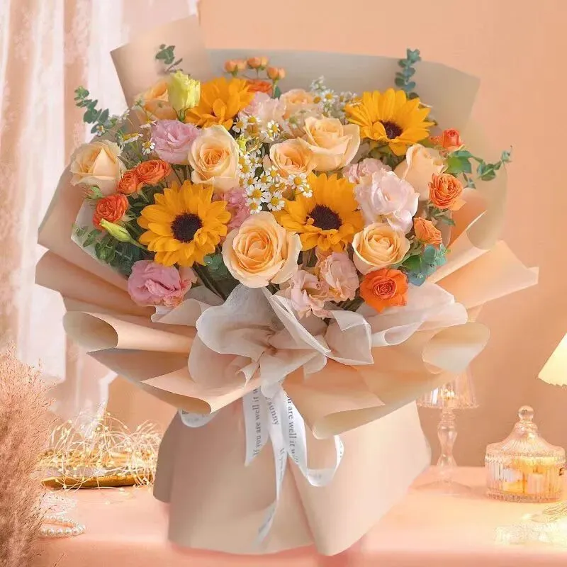爱如阳光-香槟玫瑰3枝、向日葵2枝、粉红雪山玫瑰3枝、绿色洋桔梗3枝、橙色多头玫瑰2枝、尤加利叶5枝