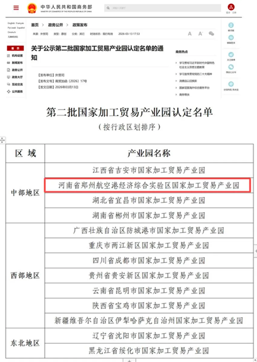 商务部近日印发《关于发布第二批国家加工贸易产业园名单的通知》,郑州航空港经济综合实验区国家加工贸易产业园成功入选,成为全国第二批13家国家加工贸易产业园之一。