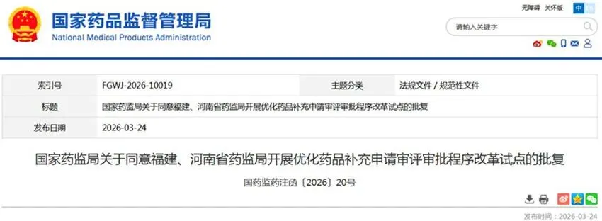 国家药品监督管理局近日正式批复,同意河南省开展优化药品补充申请审评审批程序改革试点工作。此项改革将药品重大变更事项补充申请审评由200个工作日压缩至60个工作日,审批周期压缩70%。