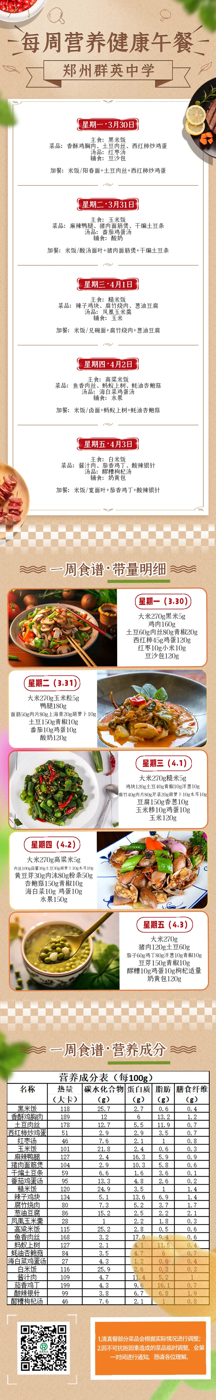 >郑州群英中学每周营养健康食谱(3月30日-4月3日)