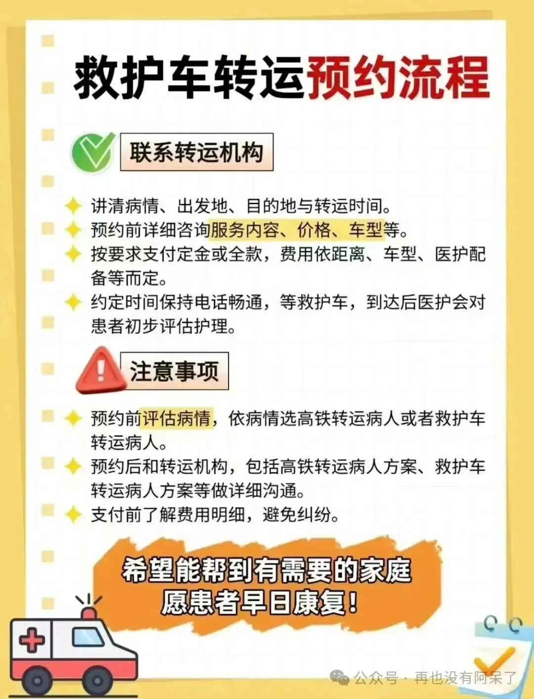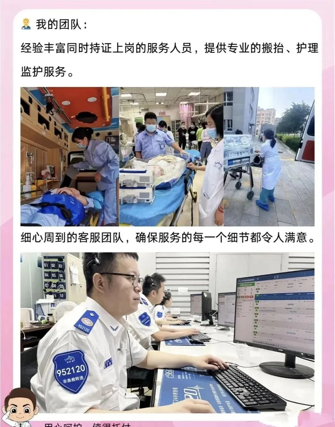 我们是救护车出租转运公司,120救护车接送病人预约护送。24小时为术后康复、危重患者及跨区域就医人群提供专业医疗转运服务,提供120救护车出租‖救护车转运‖私人120救护车(非急救)‖跨省长途转运‖危重病人转运‖市内转运‖术后康复病人转运‖高铁病人转运‖患者返乡‖大型活动赛事保障‖配备ICU设备:呼吸机▪心电监护仪▪吸痰器•微量泵•氧气▪急救药箱▪专业医护团队