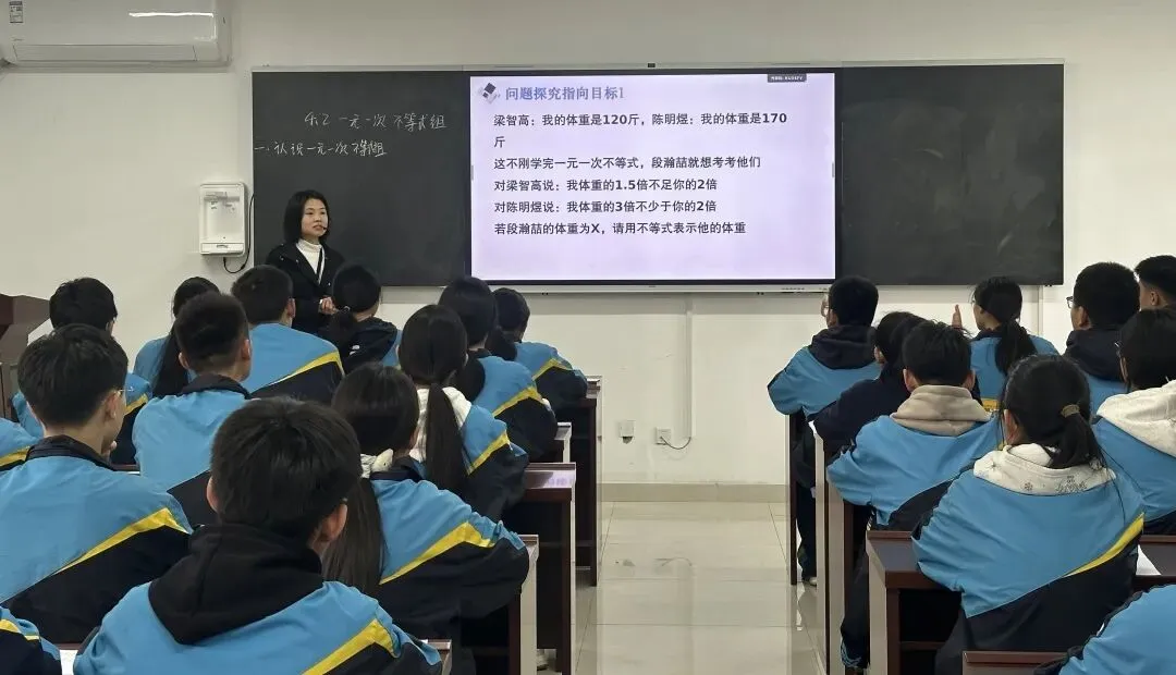 祁冰霜老师通过情景演绎,再现学生关于体重的真实讨论,自然引出一元一次不等式组的概念。采用讲练结合的方式,鼓励学生上台展示,教师适时点评、精准指导,在肯定与纠正中提升学生的数学思维与表达能力。