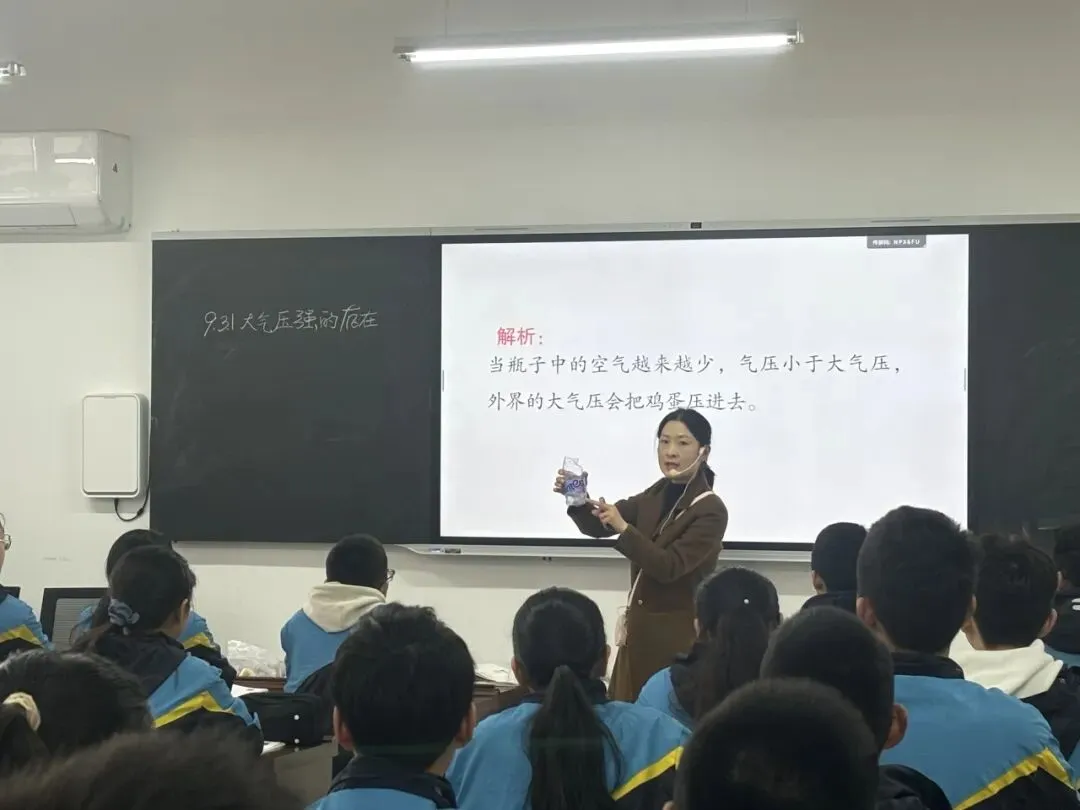 李阳老师通过“牛奶瓶吞鸡蛋”“覆杯实验”等生动演示,打破“物理即枯燥计算”的刻板印象,让学生感受到物理就在身边。课堂引导学生从生活现象验证理论,再将理论应用于生活,探寻物理学的本质。