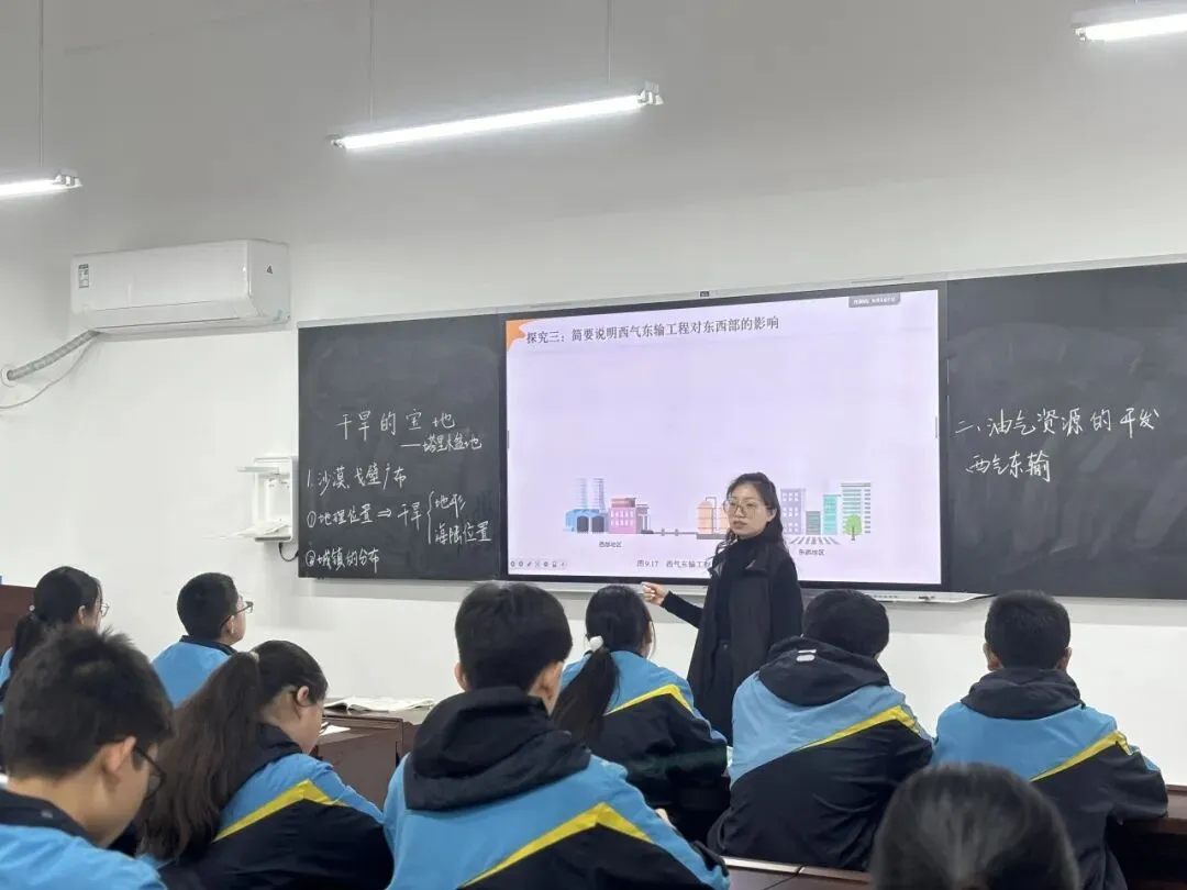 康琳渑老师在讲授《干旱的宝地——塔里木盆地》时,以荒漠与绿洲的对比导入,聚焦区域核心知识。从海陆位置与地形双重视角解析干旱成因,引导学生读图探究城镇沿绿洲的环状分布,理解水资源的主导作用。结合数据与实例讲解油气开发与西气东输工程,兼顾经济效益与生态保护,渗透人地协调观念。课堂学练结合,重点突出,有效落实了地理核心素养。