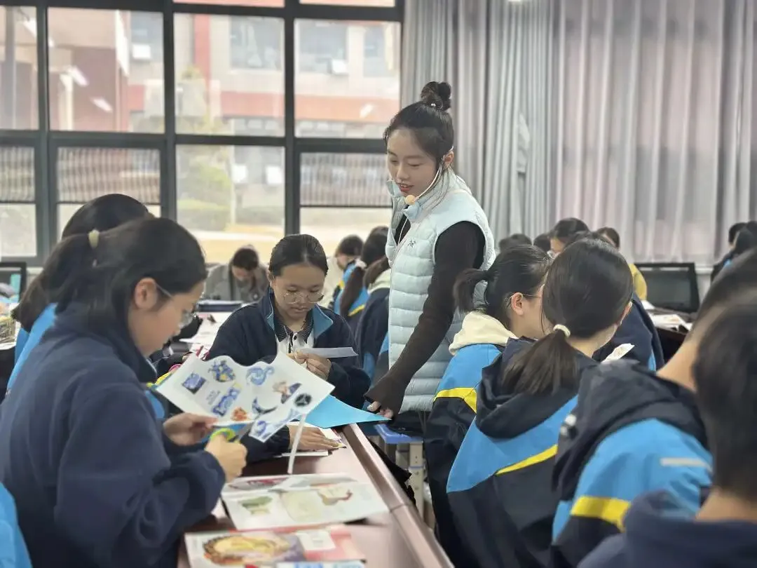 王梦菲老师通过电影海报引出《广而告之》课题,讲解海报的文字、图像、色彩及版式设计知识,帮助学生构建设计基础。学生以小组合作形式,运用拼贴手法创作“校园艺术节”海报,提升了课堂参与度与实践能力。