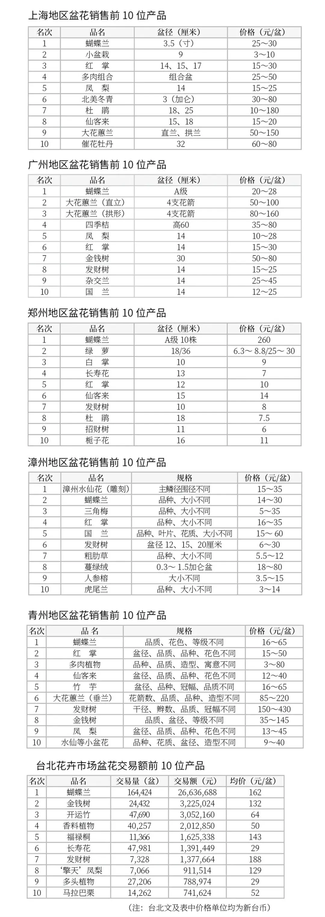 兰花 上旬市场销售仍以带花苞的成品兰为主,下旬转向裸苗、组培苗批发。墨兰‘企黑’3~5元/苗,‘金华山’‘金凤锦’‘春雅锦’等6~20元/苗,‘摩爪’达30~50元/苗。春兰‘宋梅’‘花开富贵’6~10元/苗,‘转色红荷’40~60元/苗。建兰‘青山玉泉’‘彩虹’‘市长红’等3~8元/苗,‘赤诚’50元/苗,‘国魂’500元/苗。蝴蝶兰3.5寸盆开花株22~30元/株,2.8~3寸盆中小花14~20元/株。