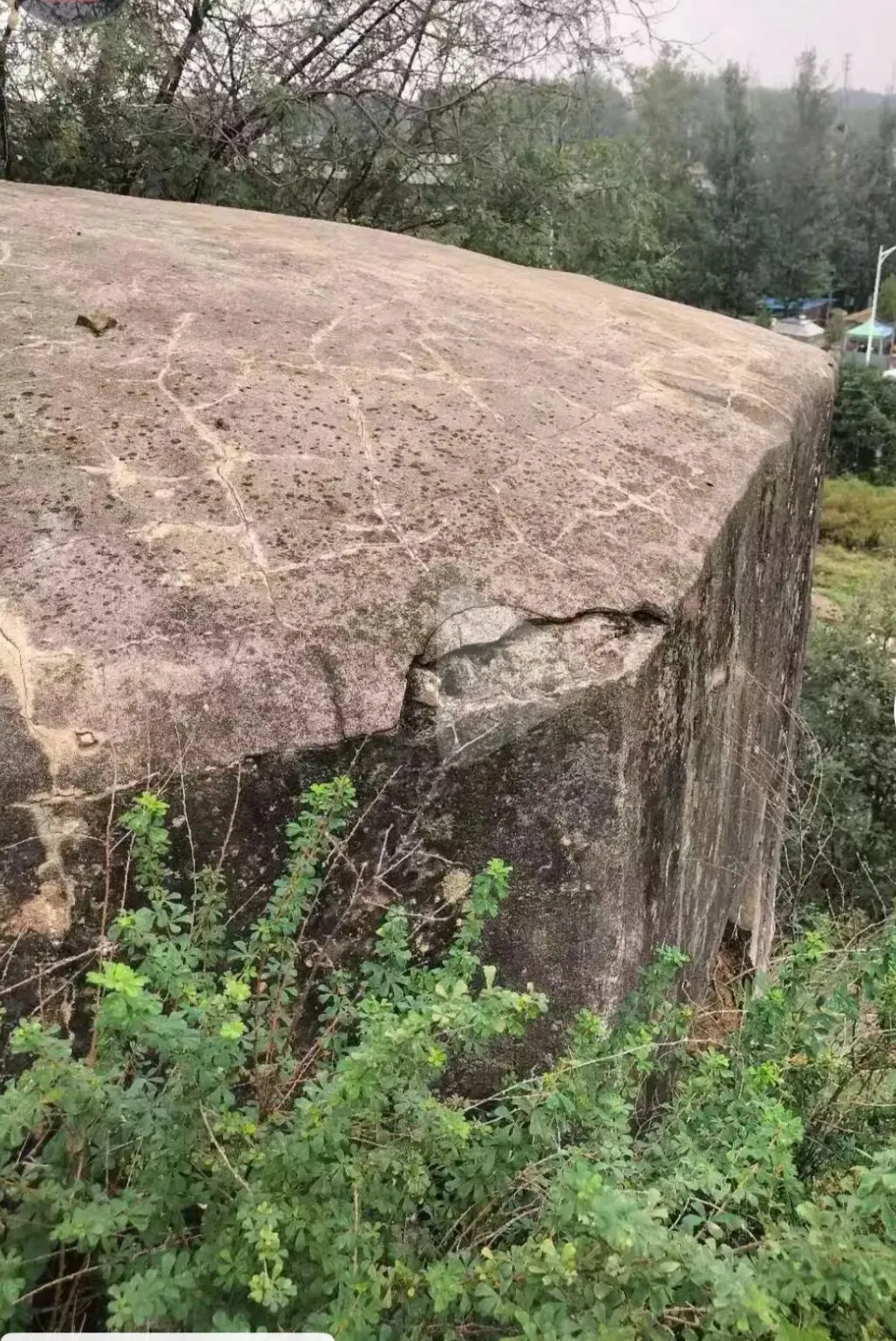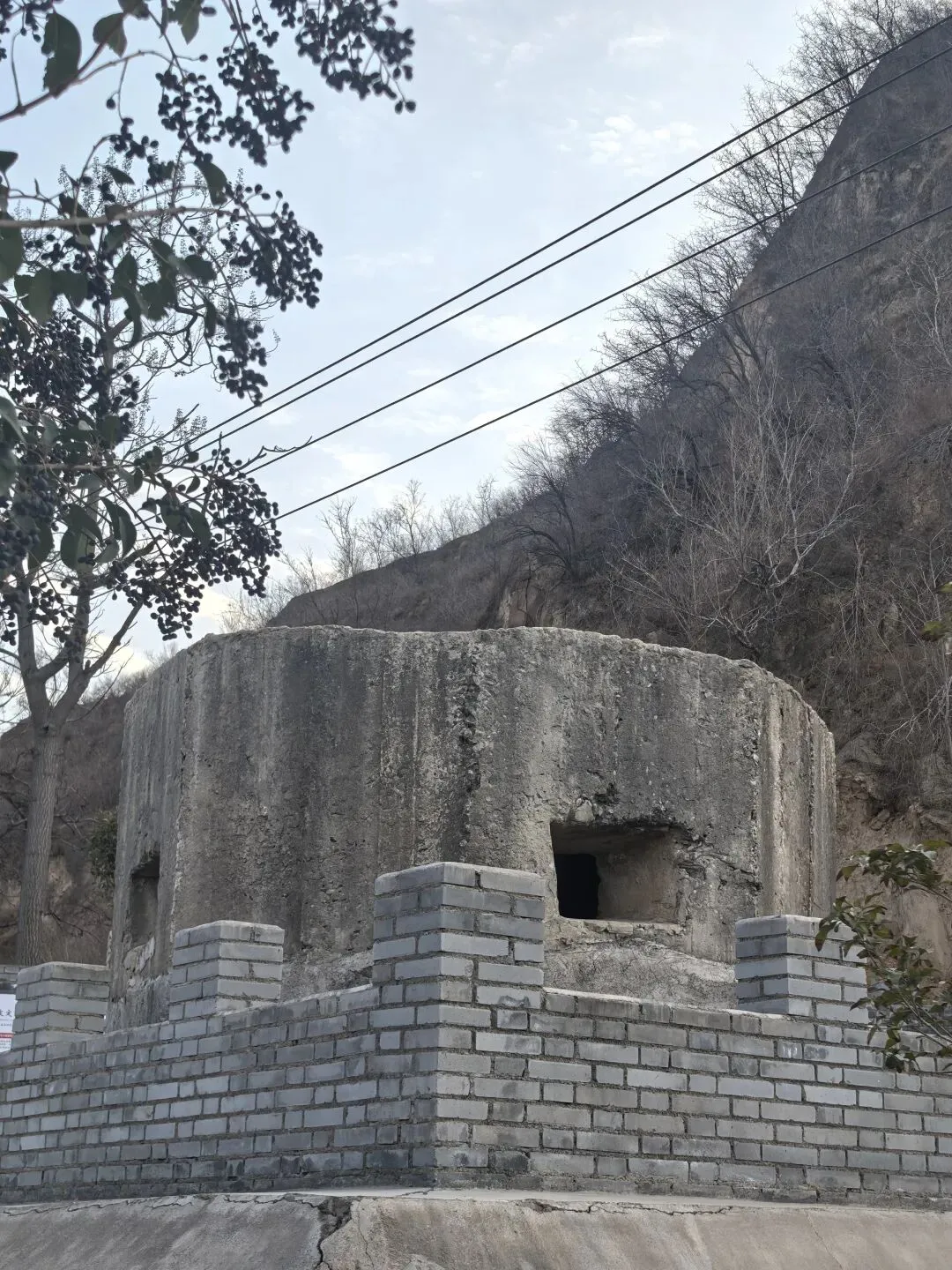 王寨沟村口南边100米靠山嵌边还有一个破坏的碉堡,因为修路把它破坏了,只留下了三分之一结构,清晰可见其为水泥红石块(象铁路上的枕石)结构。图3