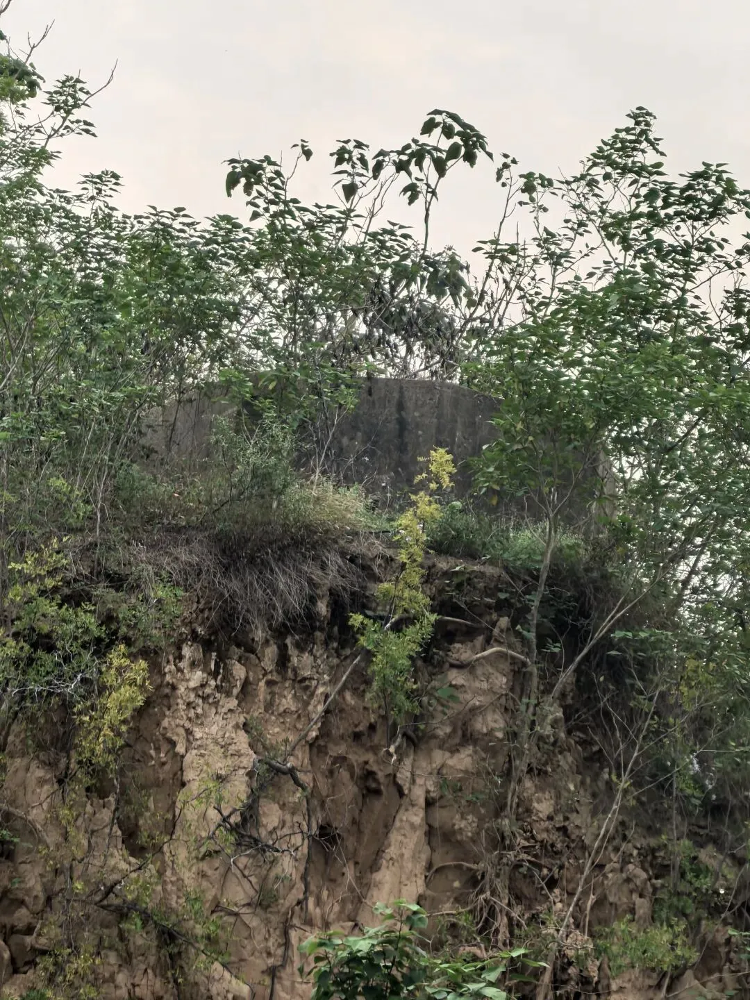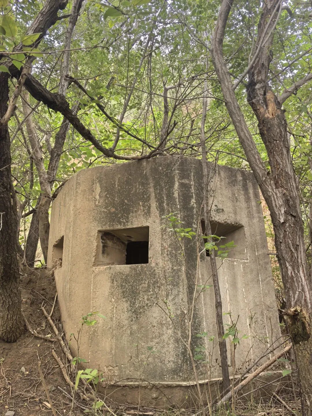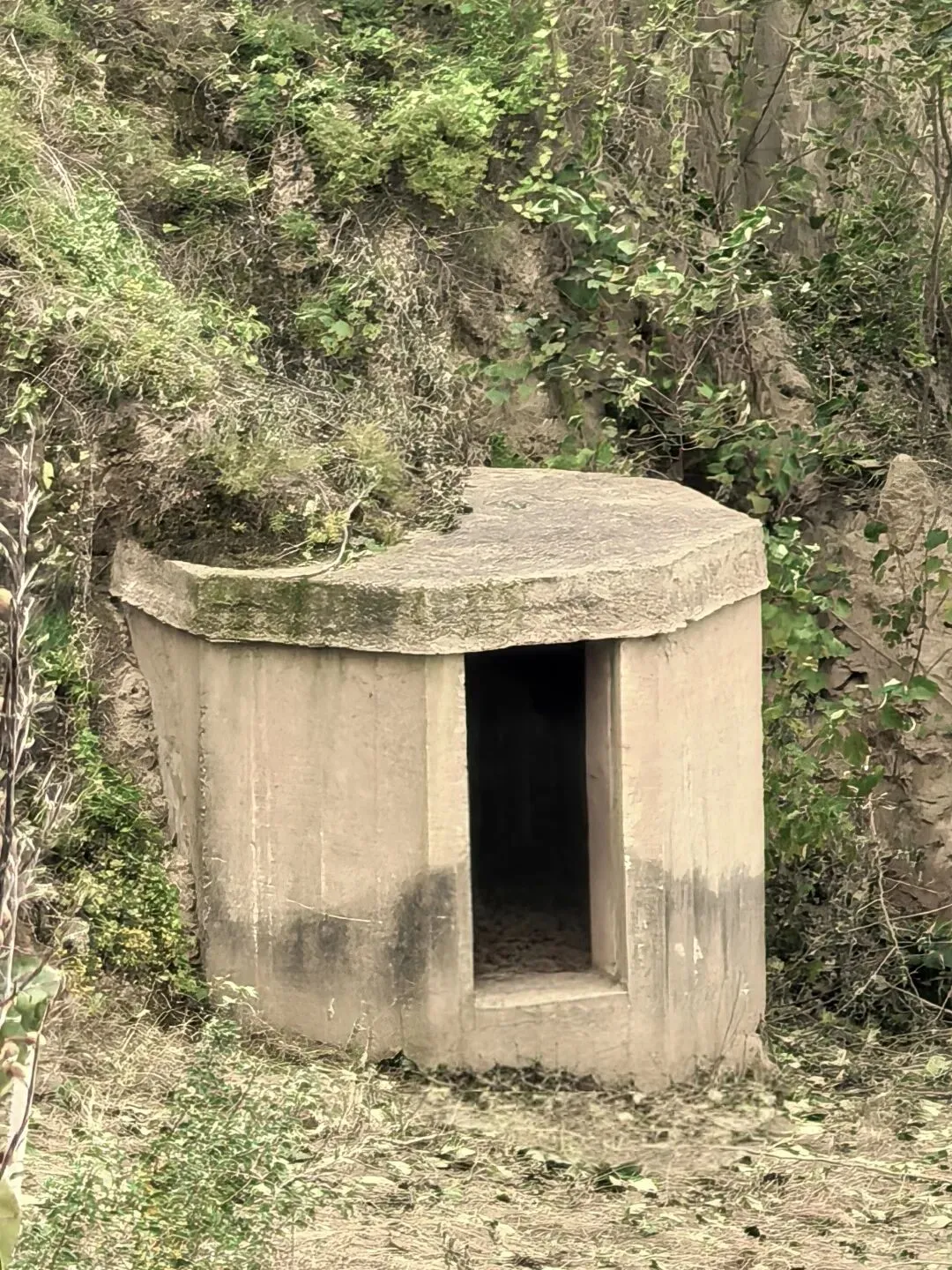 再次沿京广线往北王寨沟沟口路北山上有一座碉堡,在绿树掩映下,只露了一个小小头,碉堡机枪口面向黄河滩,也是3个机枪口。图2