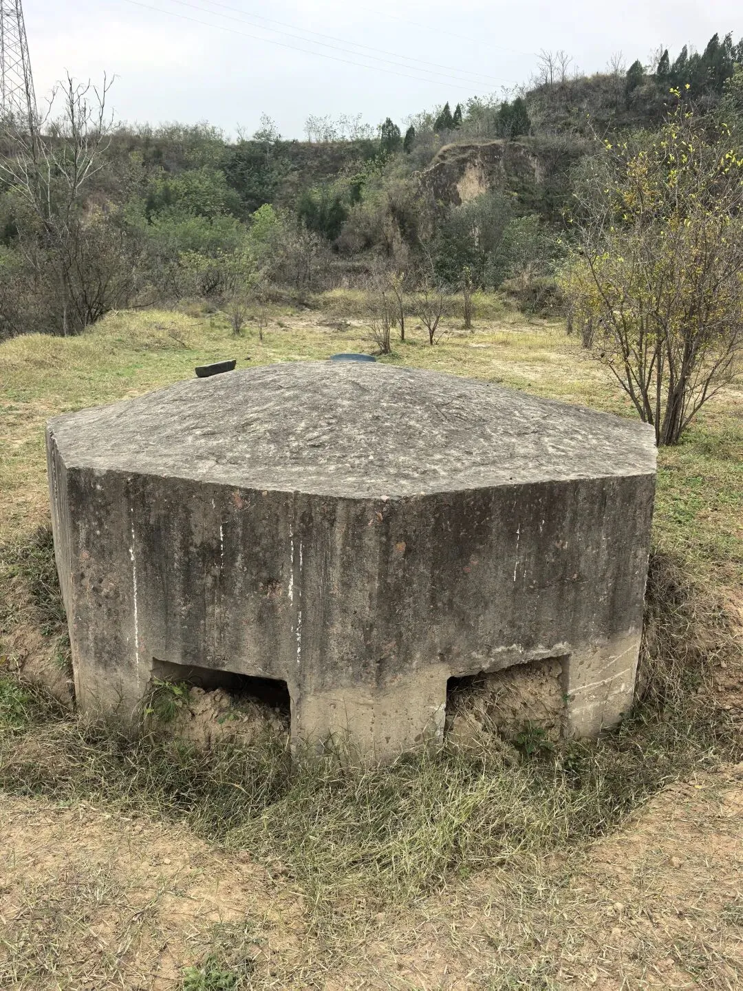 首先是惠济区西山路1号,思念果岭涵洞口西边,原有碉堡2座,一座紧邻老京广铁路线,前几年因基建施工埋于院内地下。另一座坐落于西山遗址东南角的山上,现保存完整。该碉堡现埋于地下1米多,地上有1.2米高,是一个八棱体碉堡,直径有3米,碉堡壁厚有60公分左右,正面有三个机枪射击孔,均朝向东南枯河铁路桥方向,碉堡背面有个入口,因为土地平整等因素导致地形变化,现在无法进入碉堡内,我们拍了照片。图1