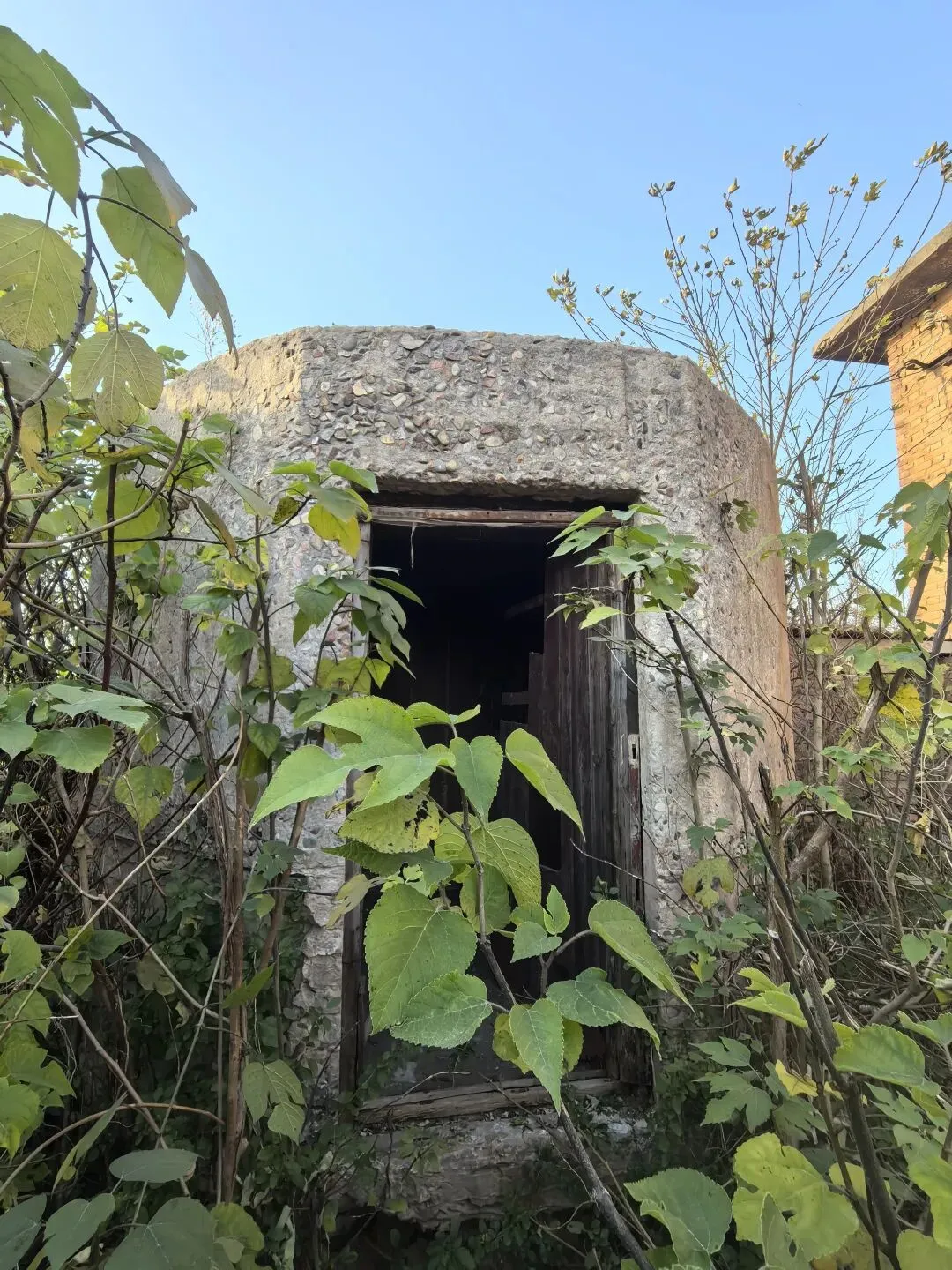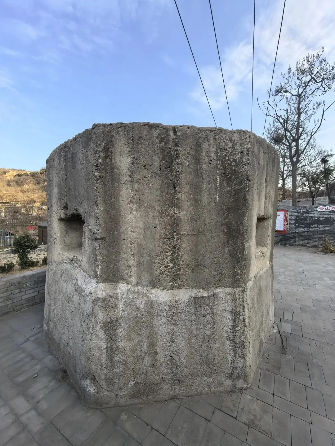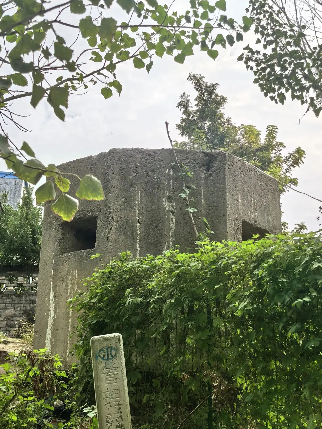 康店镇裴峪村沟口有1个,保存完整。主体为混凝土结构,呈八菱形,高2.20米,直径3米,三个射击孔,一个门,厚度有60公分。该村把这里建成了红色抗战公园,有简介有说明,非常有意义。图17、18