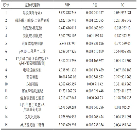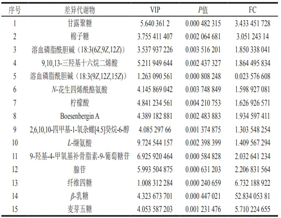 进一步对比湿热处理前后青稞中小分子代谢物组成,筛选出345 个显著差异代谢物,差异代谢物分类比较分散(图3)。对湿热处理后上调的前15差异代谢物进行鉴定(表2),主要为有机酸及其衍生物、脂质和类脂分子以及有机杂环化合物类,其中丰度最高的物质是焦脱镁叶绿素a、磷脂酰乙醇胺-二氢鞘氨醇和脯氨酸-组氨酸等。焦脱镁叶绿素a是一种叶绿素衍生物,具有抗氧化功效;磷脂酰乙醇胺-二氢鞘氨醇是鞘氨醇的生物合成前体,有明显的抗癌效果。脯氨酸-组氨酸具有保护神经元、降血糖、抗氧化等生理功能。湿热处理后下调的前15差异代谢物鉴定结果如表3所示,主要为小分子糖及糖类衍生物、脂类和类脂分子、苯丙类和聚酮类,其中丰度最高的物质是甘露聚糖、棉子糖和溶血磷脂酰胆碱(18:3(6Z,9Z,12Z))。甘露聚糖和棉子糖具有益生元作用,可促进肠道有益菌生长;溶血磷脂酰胆碱(18:3(6Z,9Z,12Z))是参与信号传导和免疫调节的重要膜成分。酮类和有机酸类是主要谷物风味物质,说明湿热处理一定程度改变了青稞风味。