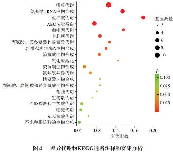 对差异代谢物进行KEGG通路富集分析,有助于从代谢途径层面揭示湿热处理对青稞物质组成的影响规律。如图4所示,差异代谢物显著富集于20 条代谢通路,主要涉及脂类、嘌呤及蛋白质类物质。其中,嘌呤代谢、氨基酰-tRNA生物合成、亚油酸代谢以及ABC转运蛋白等通路显著富集(P<0.05)。尤为突出的是,嘌呤代谢途径对湿热处理的响应最为明显,表明该处理可特异性调控青稞中嘌呤类化合物的分布。研究报道,嘌呤代谢物不仅与机体健康密切相关(如腺苷具有心血管保护作用),同时也参与食品风味的形成,例如腺苷具有心血管保护作用,但在食品中呈现苦味。因此,后续研究可聚焦于这些显著富集通路中关键代谢物的定量分析,为湿热处理青稞产品的定向开发与应用提供理论依据。