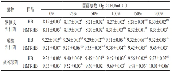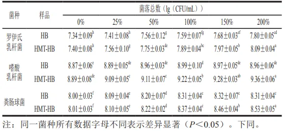 如表4所示,湿热处理前后青稞粉作为替代碳源时,均能显著促进罗伊氏乳杆菌、嗜酸乳杆菌和粪肠球菌的增殖,且在添加量为25%~200%范围内呈剂量依赖趋势,说明3 株益生菌均能有效利用青稞作为生长所需的碳源。在同等添加剂量下,HMT-HB对3 株益生菌促增殖作用显著高于HB(P<0.05)。这与Huang Lu等研究发现青稞作为碳源显著促进植物乳植杆菌和德氏乳杆菌的增殖,且经微波等热处理后,其促进该两株益生菌增殖的效果进一步增强结果相似。如表5所示,在青稞粉作为补充碳源模式下,与HB相比,HMT-HB对3 株益生菌的生长促进效果更为显著,粪肠球菌在200%添加量时菌落数较HB组提升了4.60%,且显示出强的剂量依赖性效应。以上结果表明湿热处理能够增强青稞粉促进益生菌增殖的效果,且与基础碳源的协同作用更有利于益生菌的生长。一方面,这与湿热处理促使青稞细胞壁中β-葡聚糖释放,使得青稞中可被益生菌接触利用的碳水化合物总量增加有关。另一方面,研究报道热处理可导致谷物中颗粒态淀粉部分糊化从而释放直链淀粉与支链淀粉,也会降低β-葡聚糖等膳食纤维分子质量,使得其中碳水化合物更容易被微生物利用发酵,从而提升其对益生菌的增殖效益。此外,本研究还发现,湿热处理后青稞中小分子代谢物麦芽五糖、甘露聚糖等物质增加,相较于大分子糖类,小分子糖更易于被微生物利用,这可能也是湿热处理增强青稞粉促进益生菌增殖效果的原因之一。
