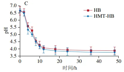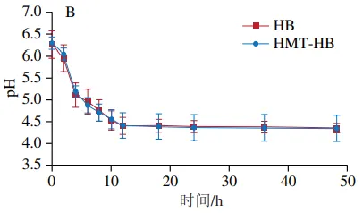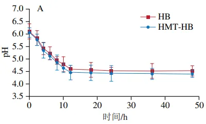 如图5所示,3 株益生菌发酵液在发酵过程中pH值均随时间延长呈逐渐下降趋势。在不同菌株中,嗜酸乳杆菌在发酵结束时pH值下降幅度最大,表明其对青稞全粉和湿热处理青稞粉的利用能力及发酵活性最强,能够产生更多短链脂肪酸等酸性代谢产物。该结果与2.4节青稞样品作为替代碳源时促进嗜酸乳杆菌增殖效果最强的结果一致。此外,在3 株益生菌发酵液中,HMT-HB的pH值均较HB更低,但均无统计学差异。