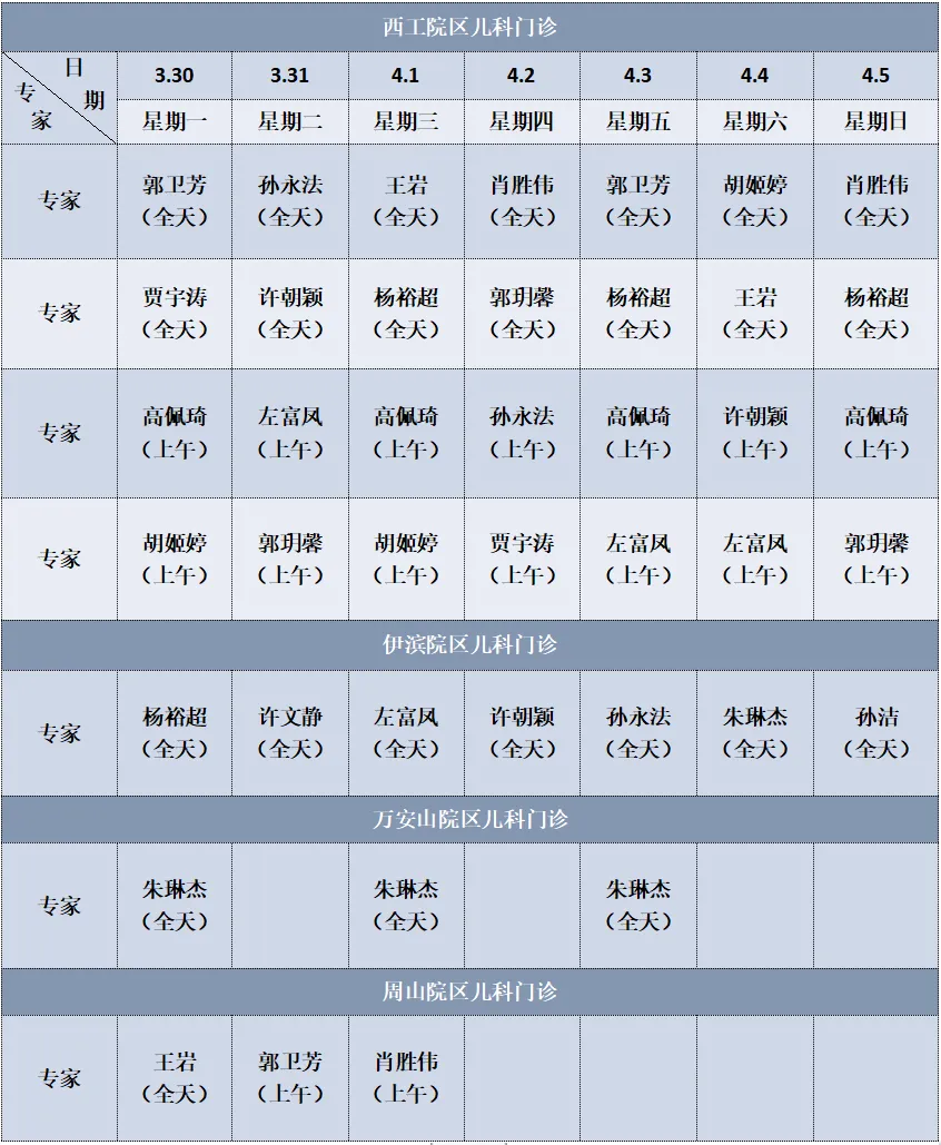 郑州大学附属洛阳市中心医院儿科/儿保门诊2026年3月30日—2026年4月5日专家坐诊时间