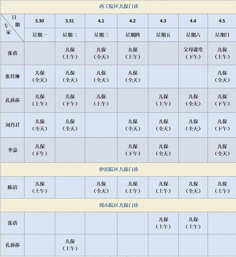 排班 儿保门诊地址:南门诊楼1楼(医院门诊楼对面,中州中路南侧)