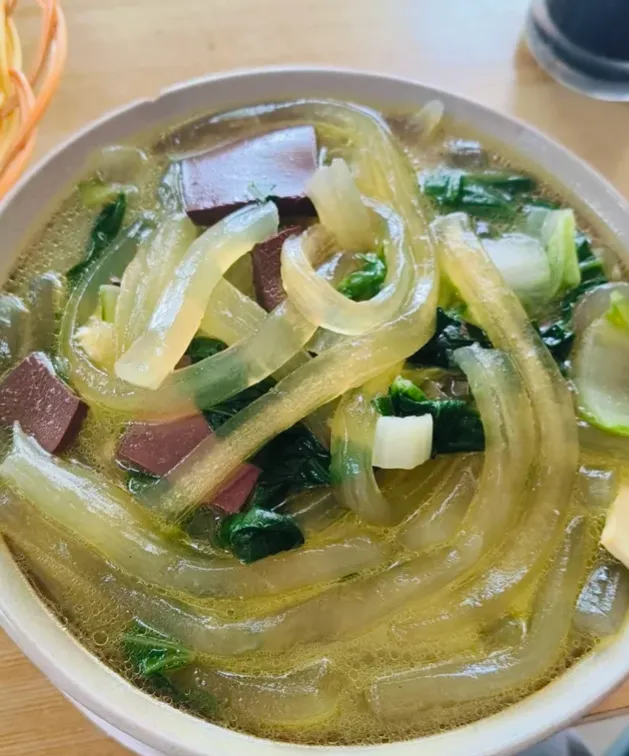 扁粉菜做法不复杂,关键在汤。一般先熬骨汤或高汤,再下红薯粉条、青菜、豆腐、猪血或丸子,最后加芝麻酱、蒜汁、胡椒和一点辣油。粉条得煮到透亮,汤得稠而不糊,入口才顺。