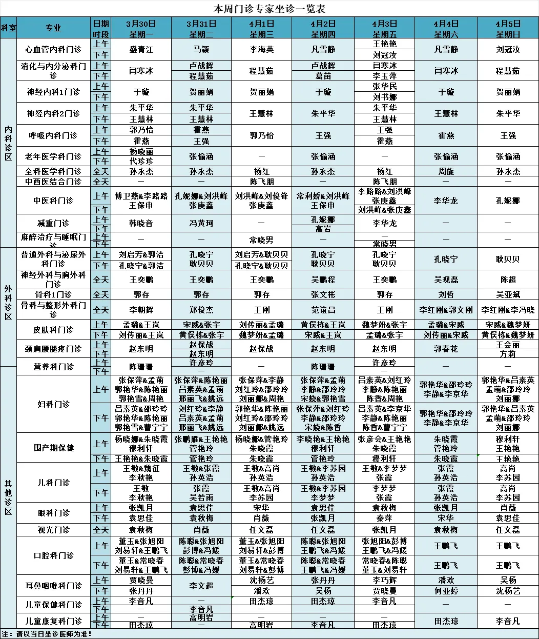 门诊排班一览表
