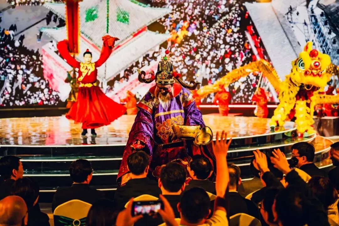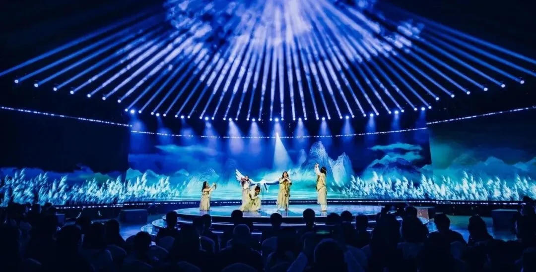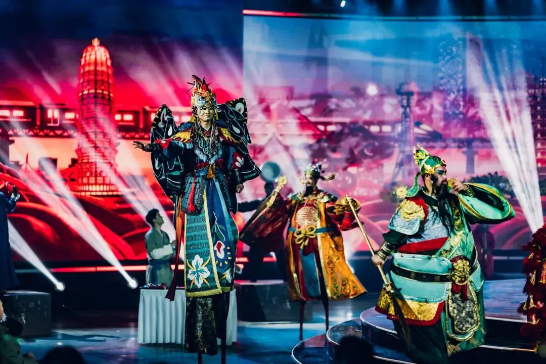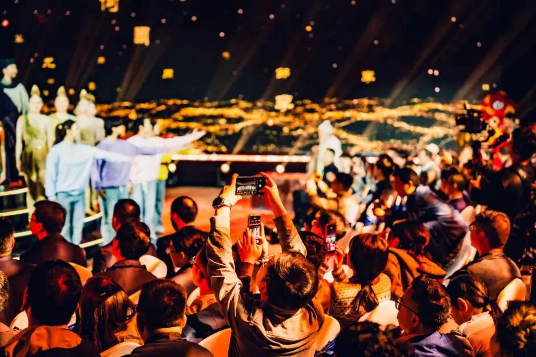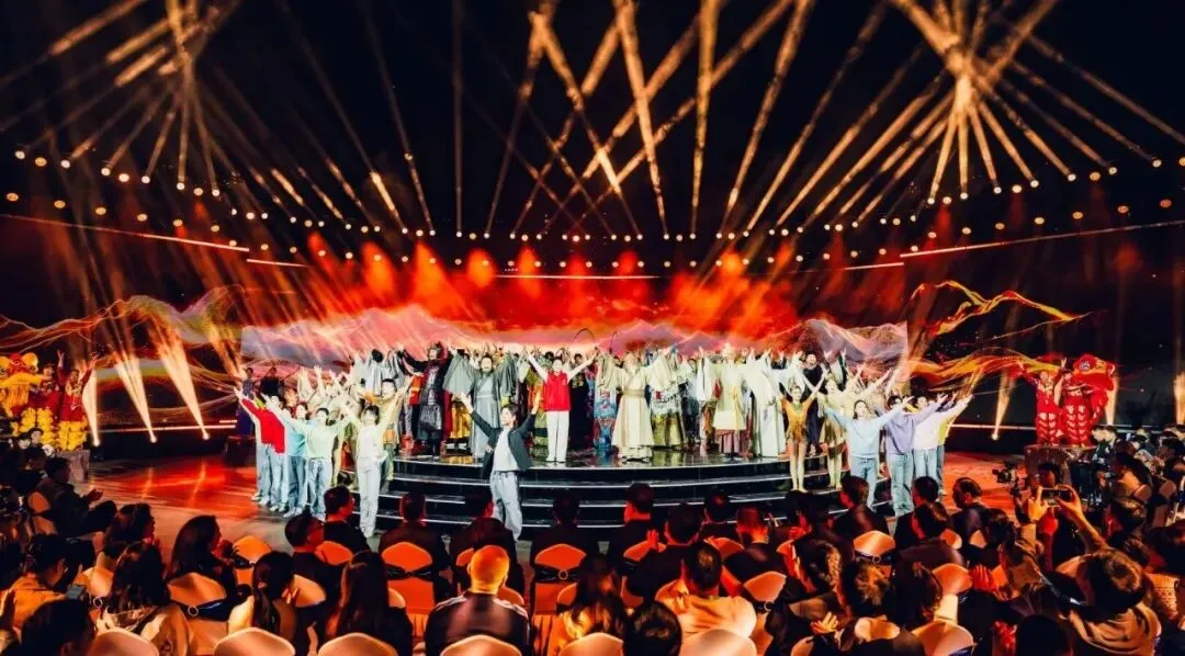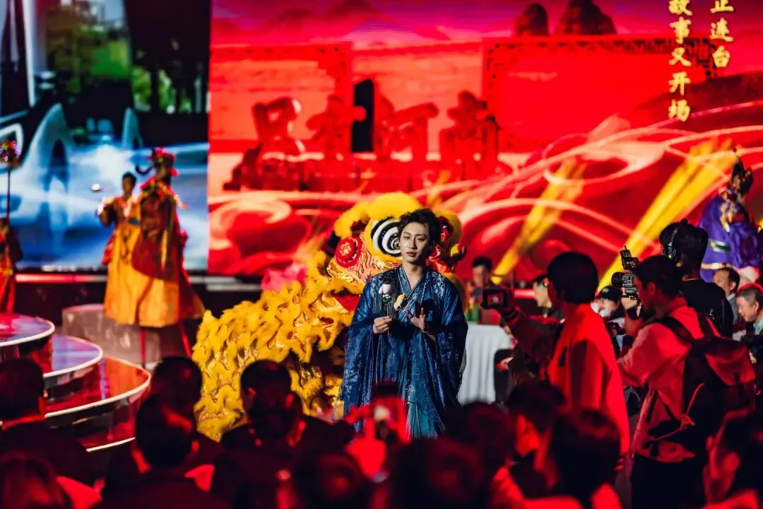 活动以“演员包观众”的创新形式,打破镜框式舞台的桎梏。中心圆形高台为主舞台,观众席通道变身为副舞台,演员穿梭其间,时而与嘉宾擦肩而过,时而邀其共舞。三面环抱的大屏与商都博物院的古老墙体形成时空对话,让千年的文明不再是遥远的符号,而是可触摸、可感知的当下。