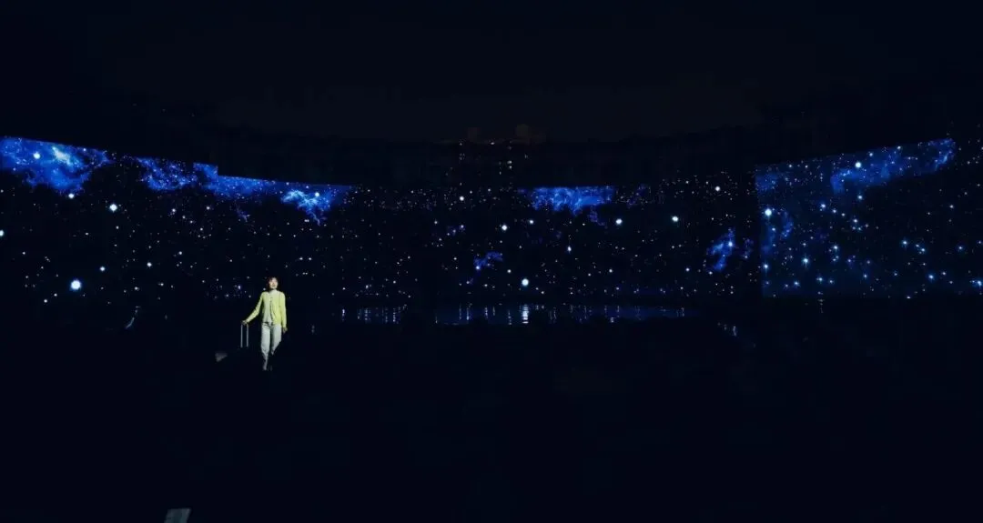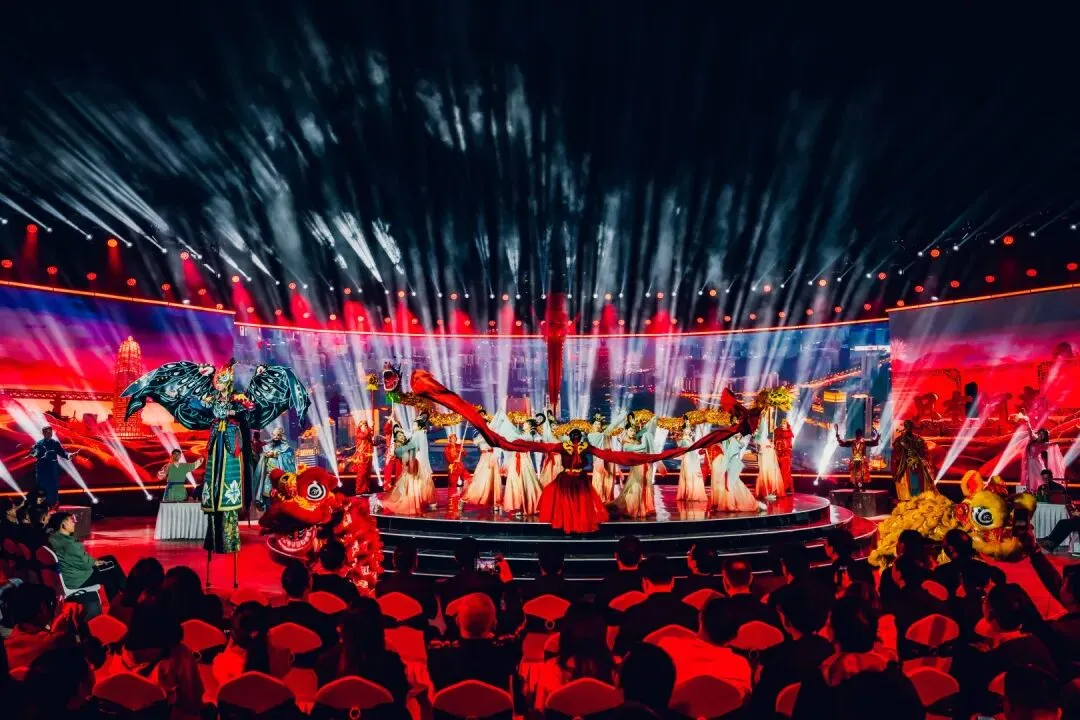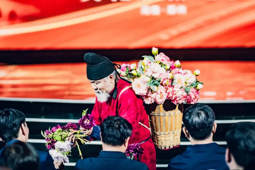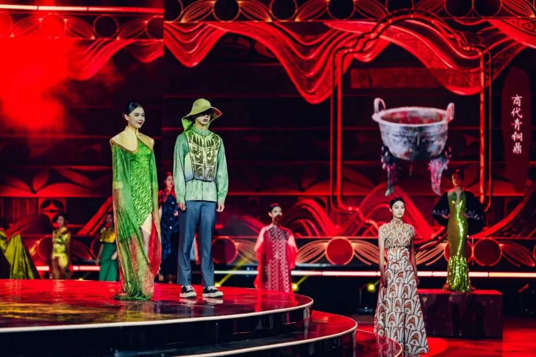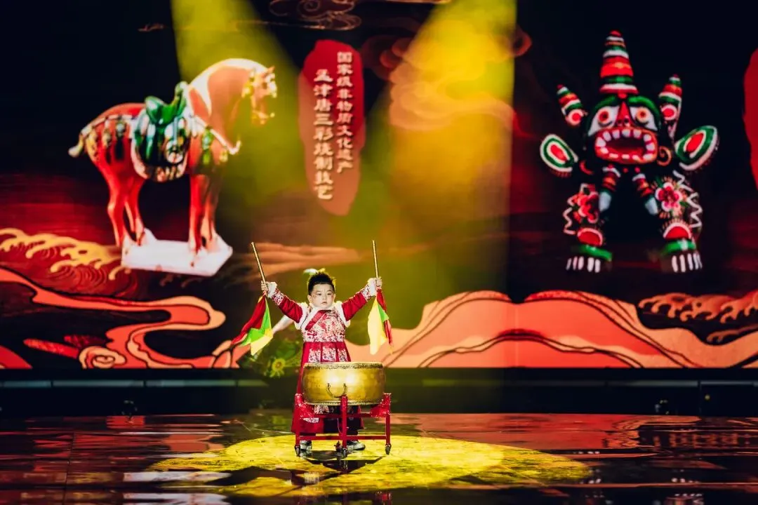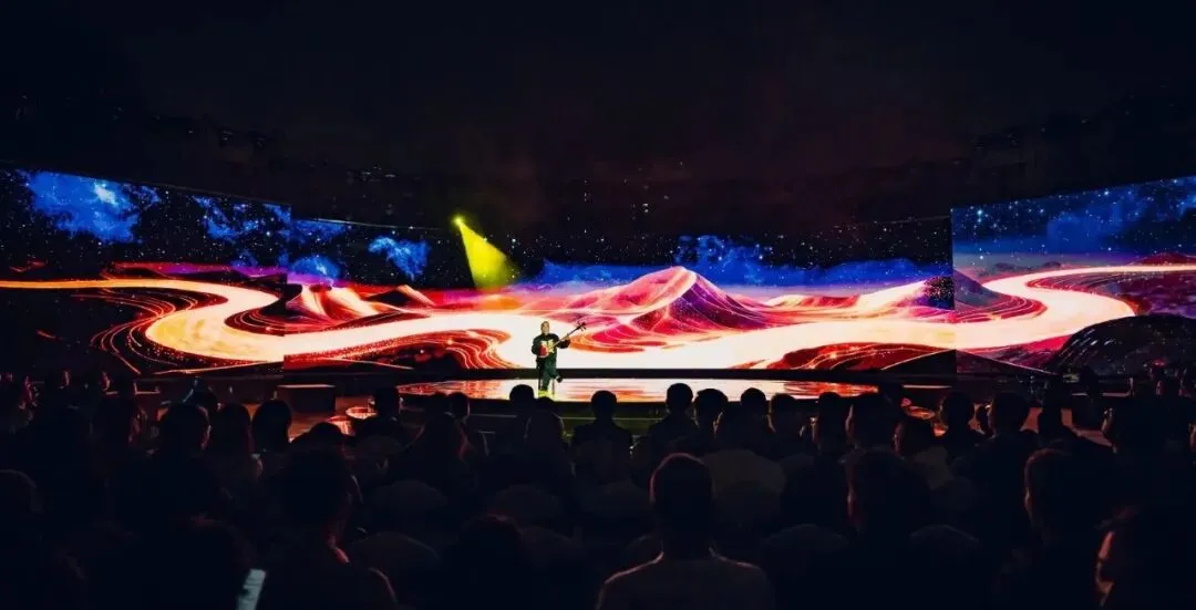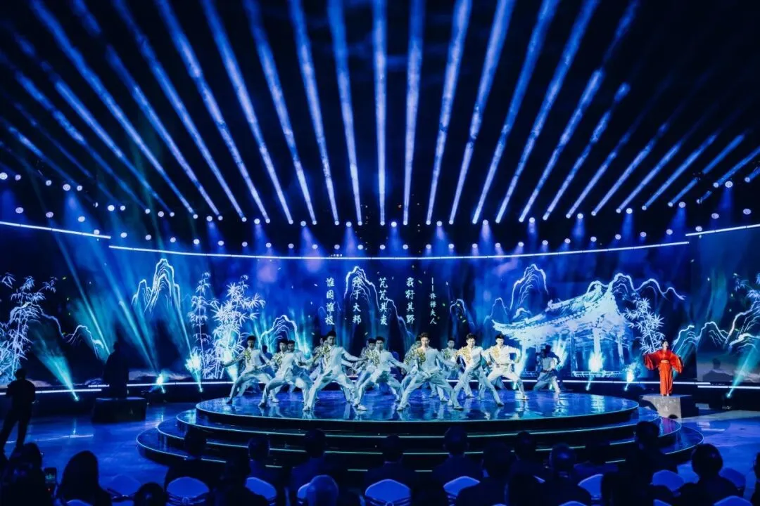 活动以“演员包观众”的创新形式,打破镜框式舞台的桎梏。中心圆形高台为主舞台,观众席通道变身为副舞台,演员穿梭其间,时而与嘉宾擦肩而过,时而邀其共舞。三面环抱的大屏与商都博物院的古老墙体形成时空对话,让千年的文明不再是遥远的符号,而是可触摸、可感知的当下。