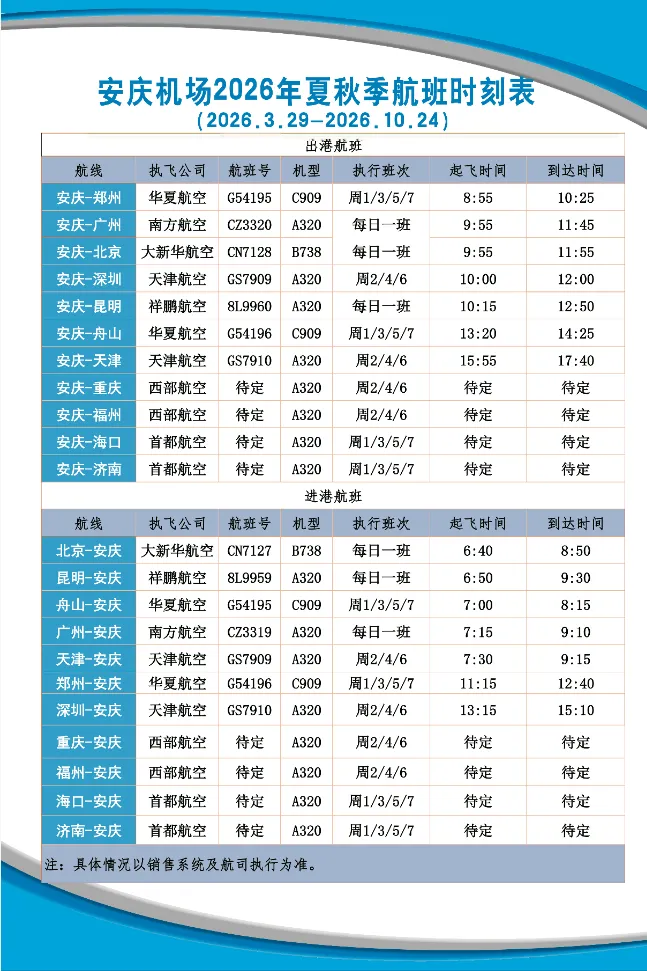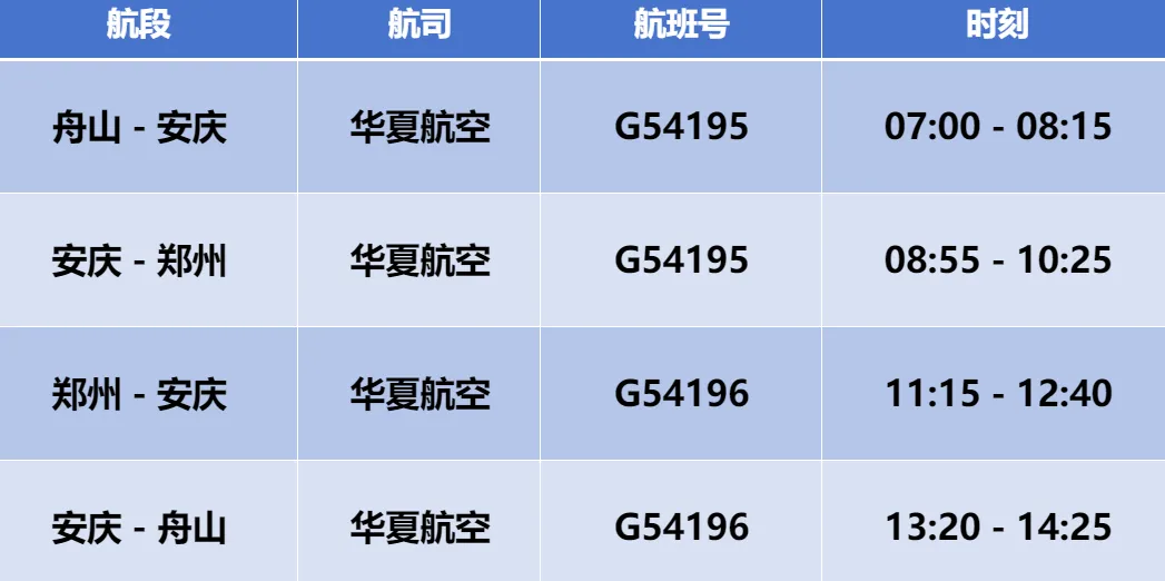 安庆机场“舟山=安庆=郑州”航线每周1/3/5/7执飞,采用C909机型。新航线,新机型,优惠的机票价格,诚邀您前来体验!