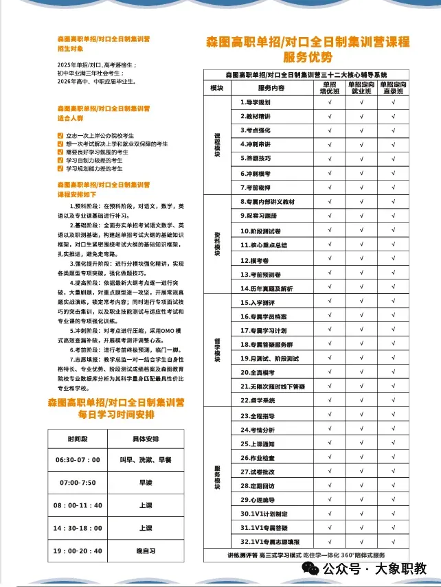在森图教育对口/单招培训课程中,我们将提供全面而系统的知识讲解,涵盖语文、数学、英语等基础学科,以及专业技能的基础强化提升冲刺密押技巧的课程培训。通过丰富多样的教学方法,激发你的学习兴趣,提高你的学习能力。同时,为了让你更好地适应考试环境,我们还会组织大量模拟考试和实战演练,让你在真正的考场上能够从容应对,发挥出自己最佳水平。
