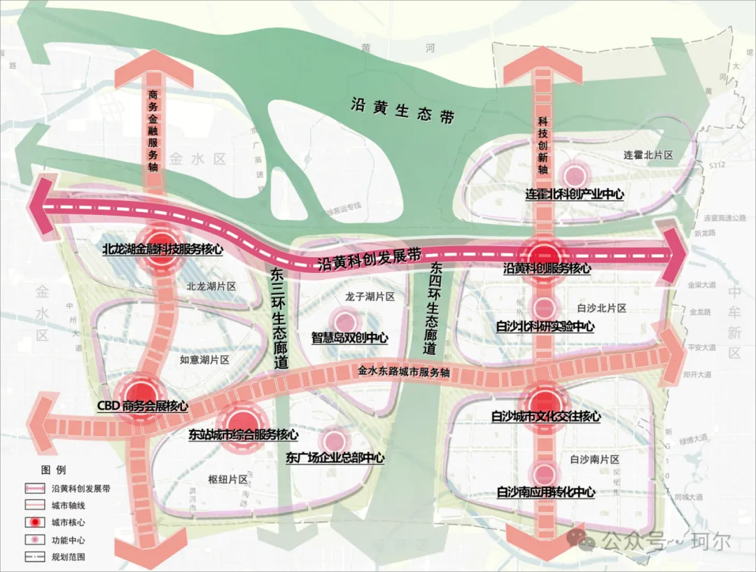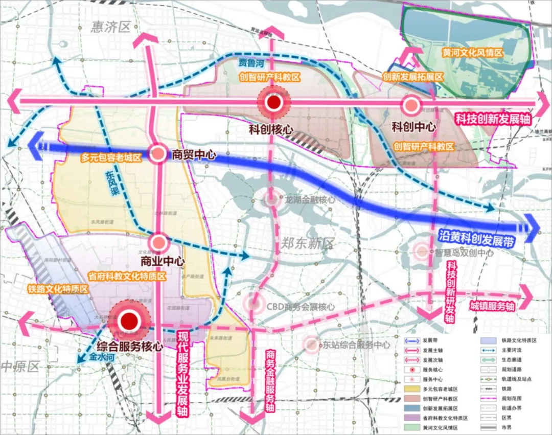 金水区:定位“中部创智服务高地、现代服务产业示范区、多元文化创意融合区、宜居品质生活标杆”。构建“一楔多廊·三带三轴·六片多点”格局,规划14条轨道交通线路,打造多层级轨道网络。