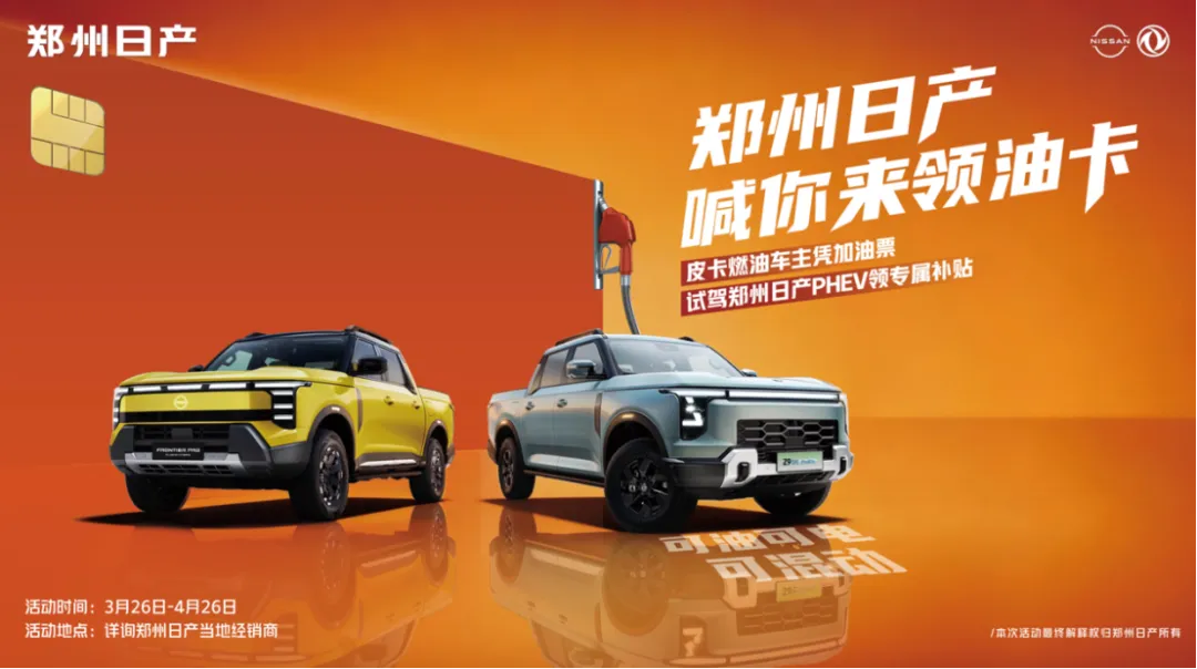 即日起至4月26日,所有皮卡燃油车主只需持30天内的任意加油站加油记录或发票,前往郑州日产全国授权经销商门店,完成PHEV车型试驾,即可获得100元油卡!