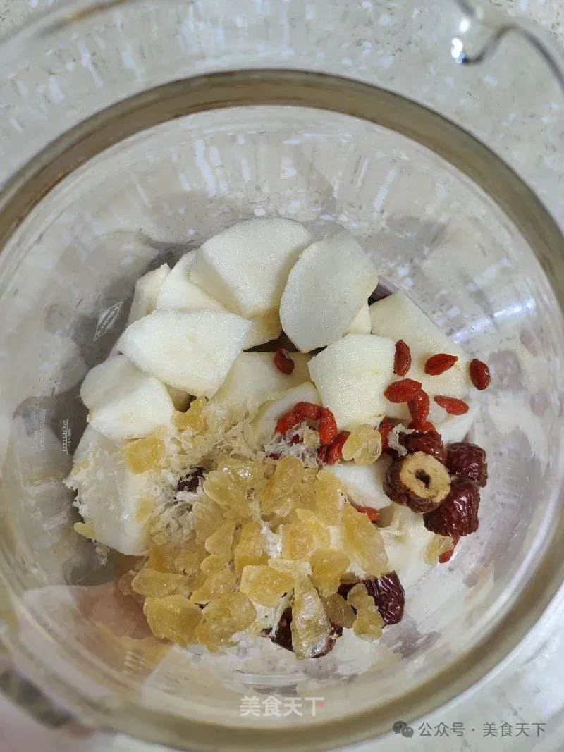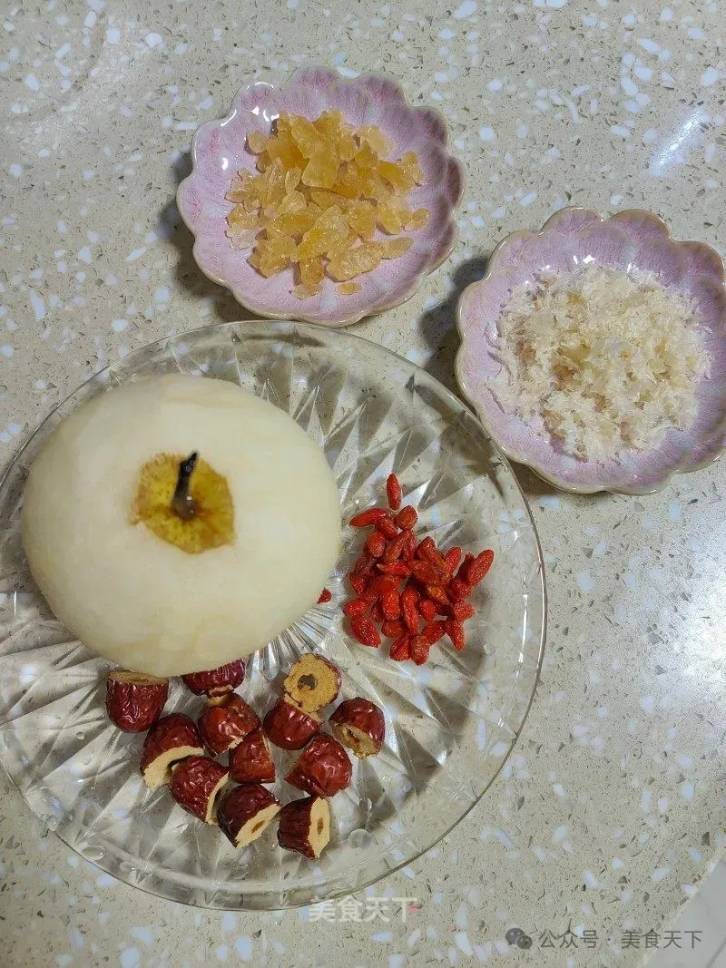 1. 准备食材:雪梨、燕耳、红枣、枸杞子、黄冰糖。